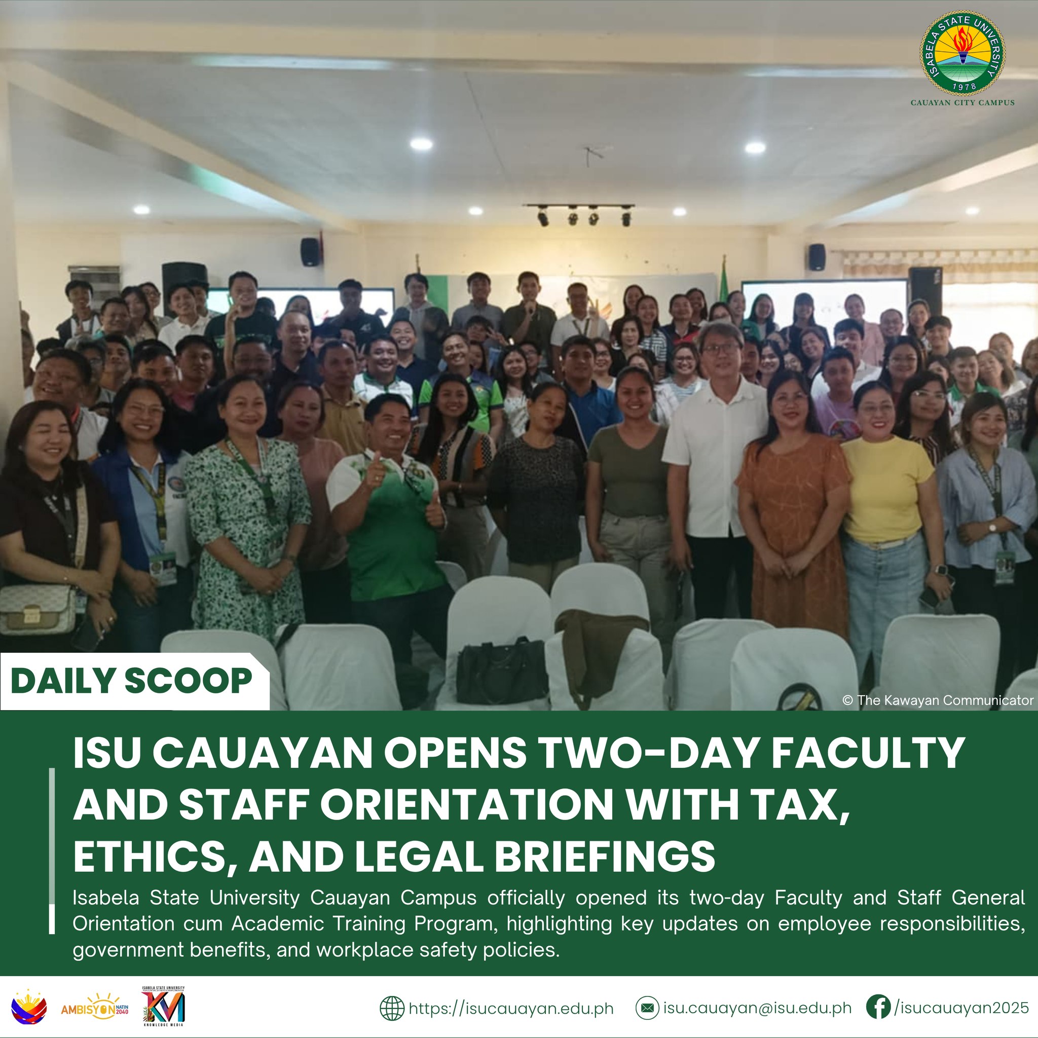 Isabela State University Cauayan Campus officially opened its two-day Faculty and Staff General Orientation cum Academic Training Program, highlighting key updates on employee responsibilities, government benefits, and workplace safety policies. Day 1 featured a series of informative sessions starting with Mr. Christian Lloyd A. Rivera, Campus Accountant, who discussed updates on income tax computation. Ms. continue reading : ๐๐๐ ๐๐๐ฎ๐๐ฒ๐๐ง ๐๐ฉ๐๐ง๐ฌ ๐๐ฐ๐จ-๐๐๐ฒ ๐ ๐๐๐ฎ๐ฅ๐ญ๐ฒ ๐๐ง๐ ๐๐ญ๐๐๐ ๐๐ซ๐ข๐๐ง๐ญ๐๐ญ๐ข๐จ๐ง ๐ฐ๐ข๐ญ๐ก ๐๐๐ฑ, ๐๐ญ๐ก๐ข๐๐ฌ, ๐๐ง๐ ๐๐๐ ๐๐ฅ ๐๐ซ๐ข๐๐๐ข๐ง๐ ๐ฌ