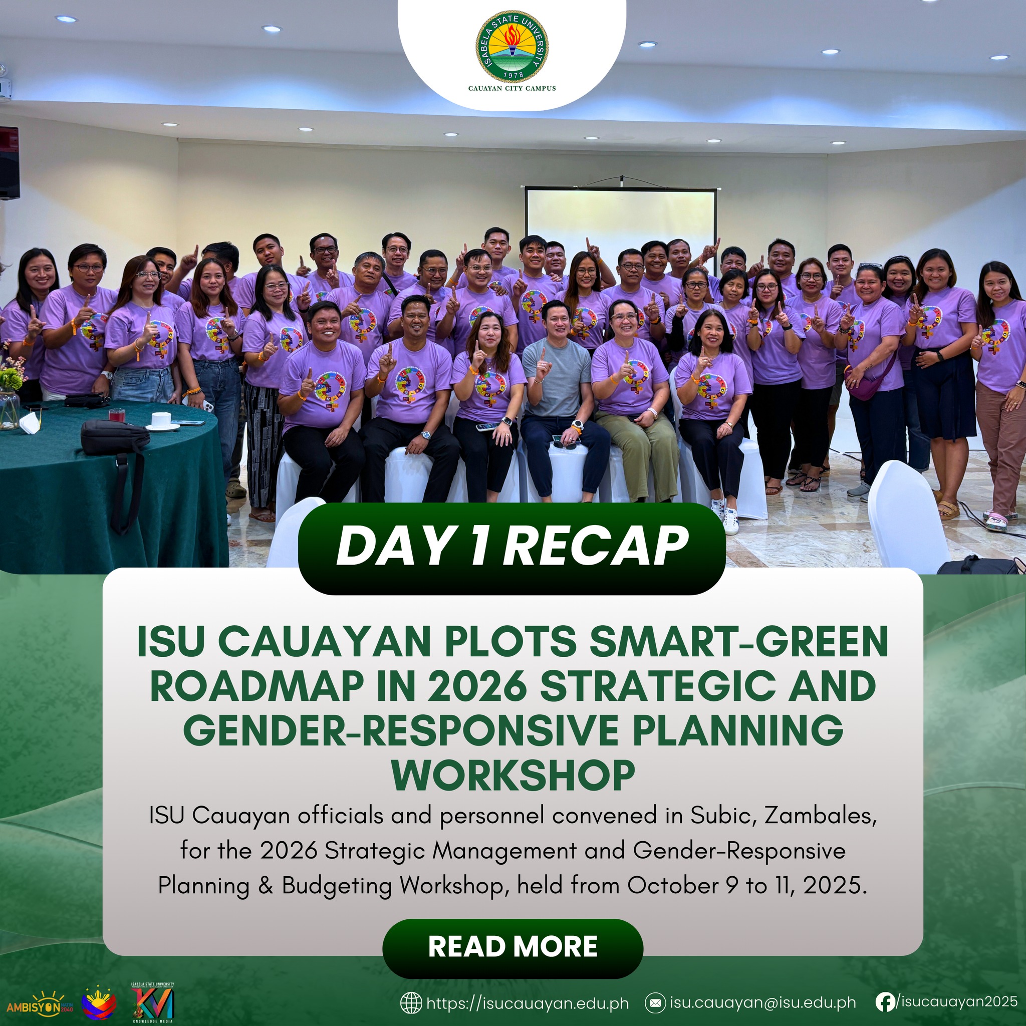 ISU Cauayan officials and personnel convened in Subic, Zambales, for the 2026 Strategic Management and Gender-Responsive Planning & Budgeting Workshop, held from October 9 to 11, 2025. Prof. Dr. Isagani P. Angeles, Jr., Vice President for Planning and Development & Management of Information and Services, graced the event. His attendance shows the Universityโs drive to continue reading : I๐๐ ๐๐๐ฎ๐๐ฒ๐๐ง ๐๐ฅ๐จ๐ญ๐ฌ ๐๐๐๐๐-๐๐ซ๐๐๐ง ๐๐จ๐๐๐ฆ๐๐ฉ ๐ข๐ง ๐๐๐๐ ๐๐ญ๐ซ๐๐ญ๐๐ ๐ข๐ ๐๐ง๐ ๐๐๐ง๐๐๐ซ-๐๐๐ฌ๐ฉ๐จ๐ง๐ฌ๐ข๐ฏ๐ ๐๐ฅ๐๐ง๐ง๐ข๐ง๐ ๐๐จ๐ซ๐ค๐ฌ๐ก๐จ๐ฉ
