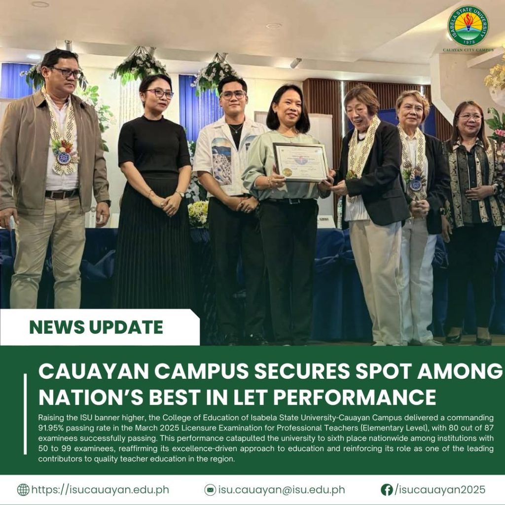 Raising the ISU banner higher, the College of Education of Isabela State University-Cauayan Campus delivered a commanding 91.95% passing rate in the March 2025 Licensure Examination for Professional Teachers (Elementary Level), with 80 out of 87 examinees successfully passing. This performance catapulted the campus to sixth place nationwide among institutions with 50 to 99 examinees, reaffirming its excellence-driven approach to education and reinforcing its role as one of the leading contributors to quality teacher education in the region.