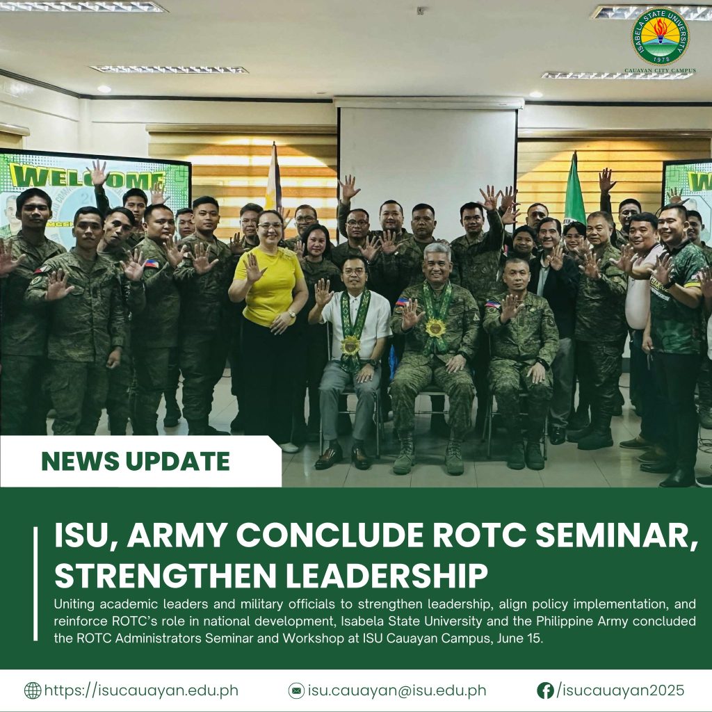 Uniting academic leaders and military officials to strengthen leadership, align policy implementation, and reinforce ROTCโ€™s role in national development, Isabela State University and the Philippine Army concluded the ROTC Administrators Seminar and Workshop at ISU Cauayan Campus, June 15.
