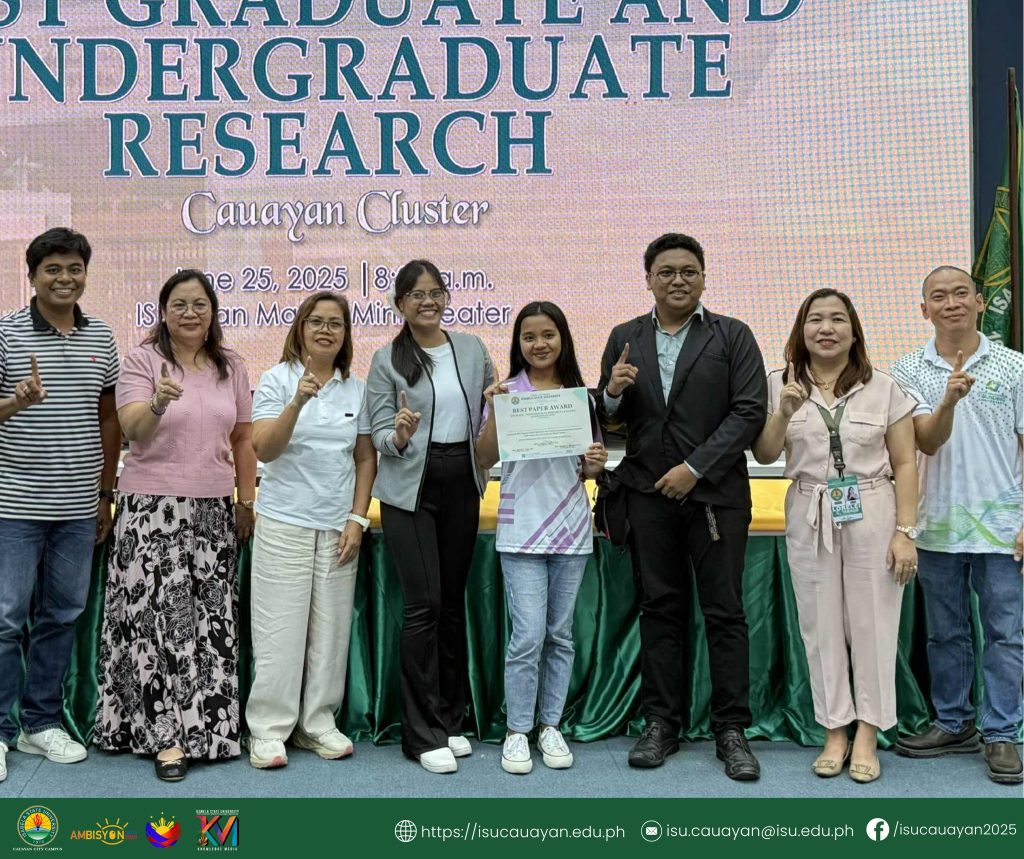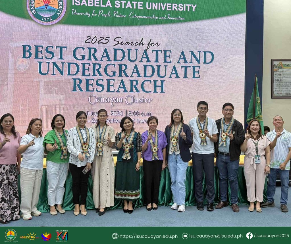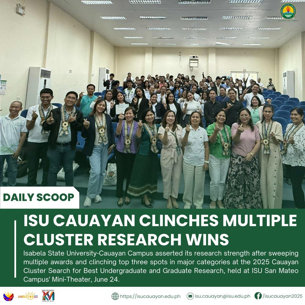 Isabela State University-Cauayan Campus asserted its research strength after sweeping multiple awards and clinching top three spots in major categories at the 2025 Cauayan Cluster Search for Best Undergraduate and Graduate Research, held at ISU San Mateo Campus’ Mini-Theater, June 24.