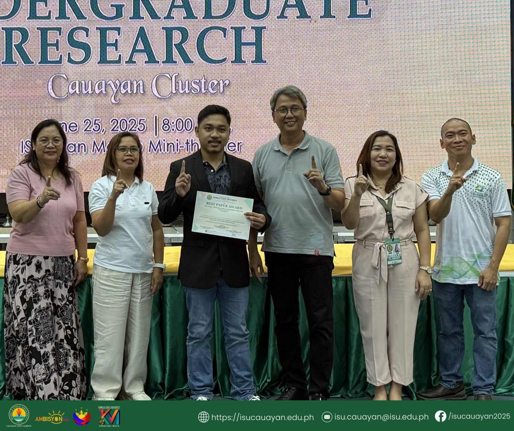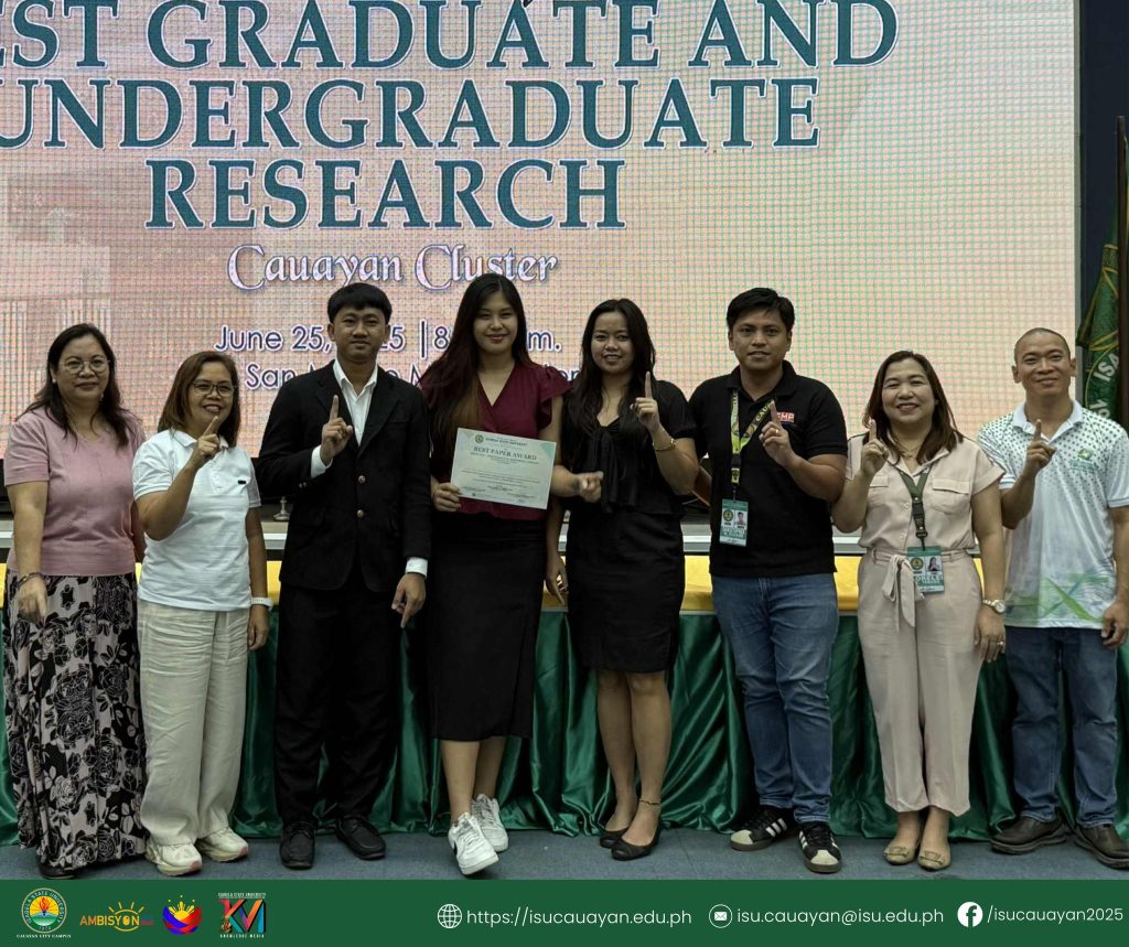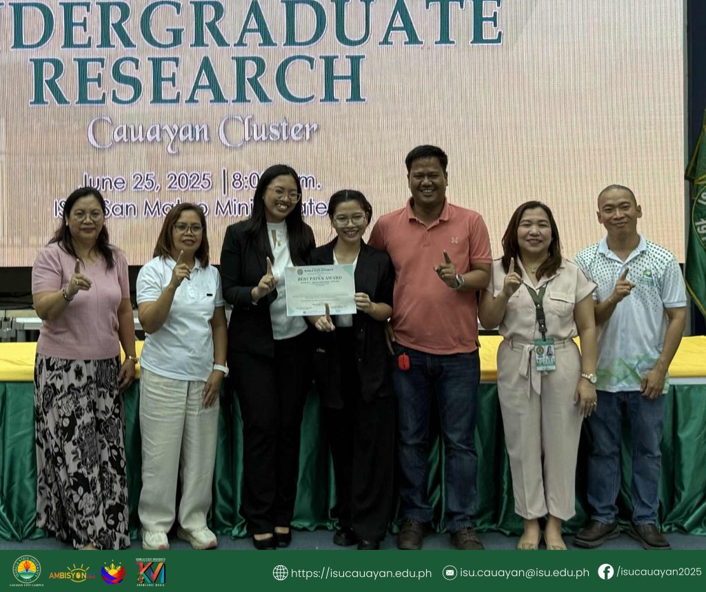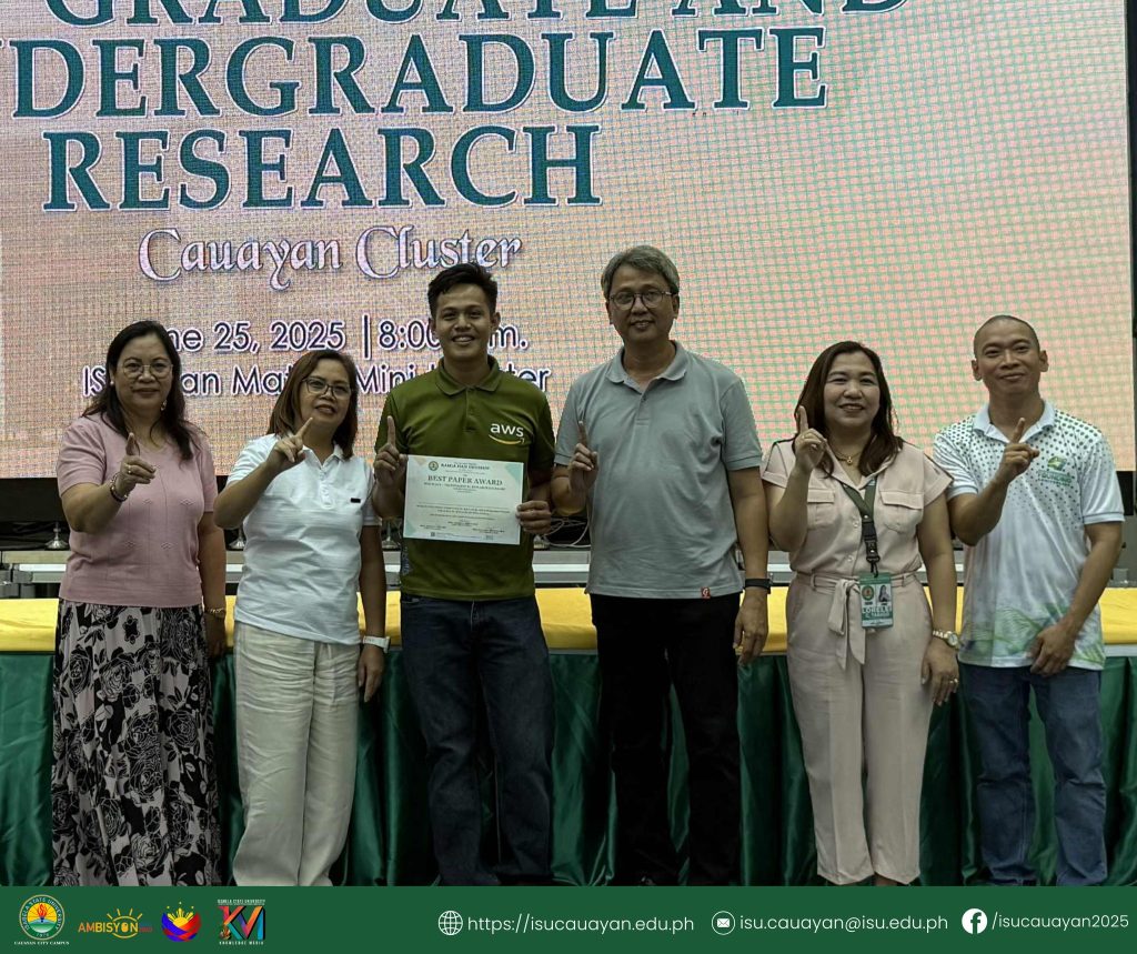 Isabela State University-Cauayan Campus asserted its research strength after sweeping multiple awards and clinching top three spots in major categories at the 2025 Cauayan Cluster Search for Best Undergraduate and Graduate Research, held at ISU San Mateo Campus’ Mini-Theater, June 24.