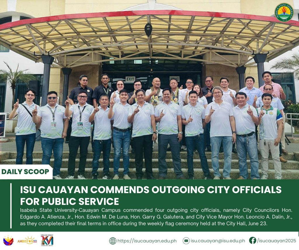 Isabela State University-Cauayan Campus commended four outgoing city officials, namely City Councilors Hon. Edgardo A. Atienza, Jr., Hon. Edwin M. De Luna, Hon. Garry G. Galutera, and City Vice Mayor Hon. Leoncio A. Dalin, Jr., as they completed their final terms in office during the weekly flag ceremony held at the City Hall, June 23.