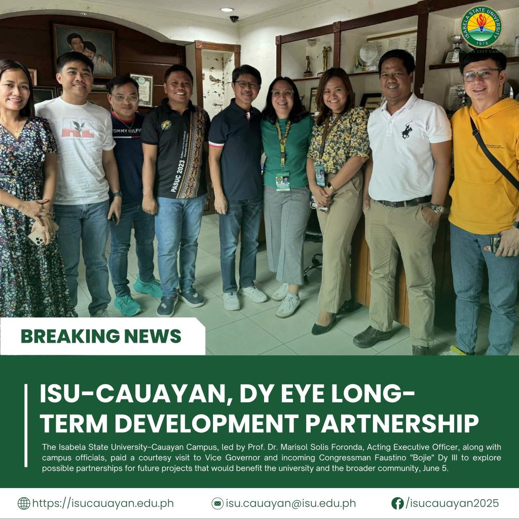 The Isabela State UniversityโCauayan Campus, led by Prof. Dr. Marisol Solis Foronda, Acting Executive Officer, along with campus officials, paid a courtesy visit to Vice Governor and incoming Congressman Faustino “Bojie” Dy III to explore possible partnerships for future projects that would benefit the university and the broader community, June 5.