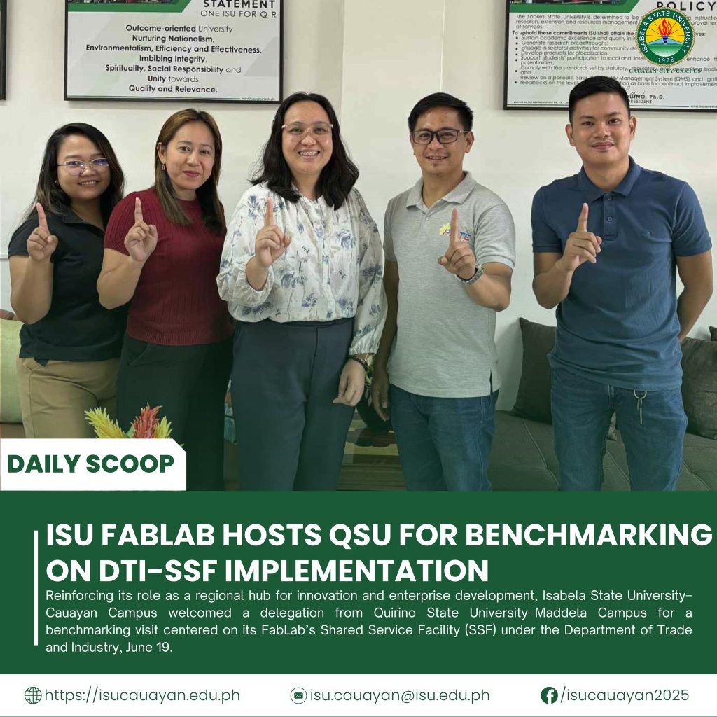Reinforcing its role as a regional hub for innovation and enterprise development, Isabela State UniversityβCauayan Campus welcomed a delegation from Quirino State UniversityβMaddela Campus for a benchmarking visit centered on its FabLabβs Shared Service Facility (SSF) under the Department of Trade and Industry, June 19.