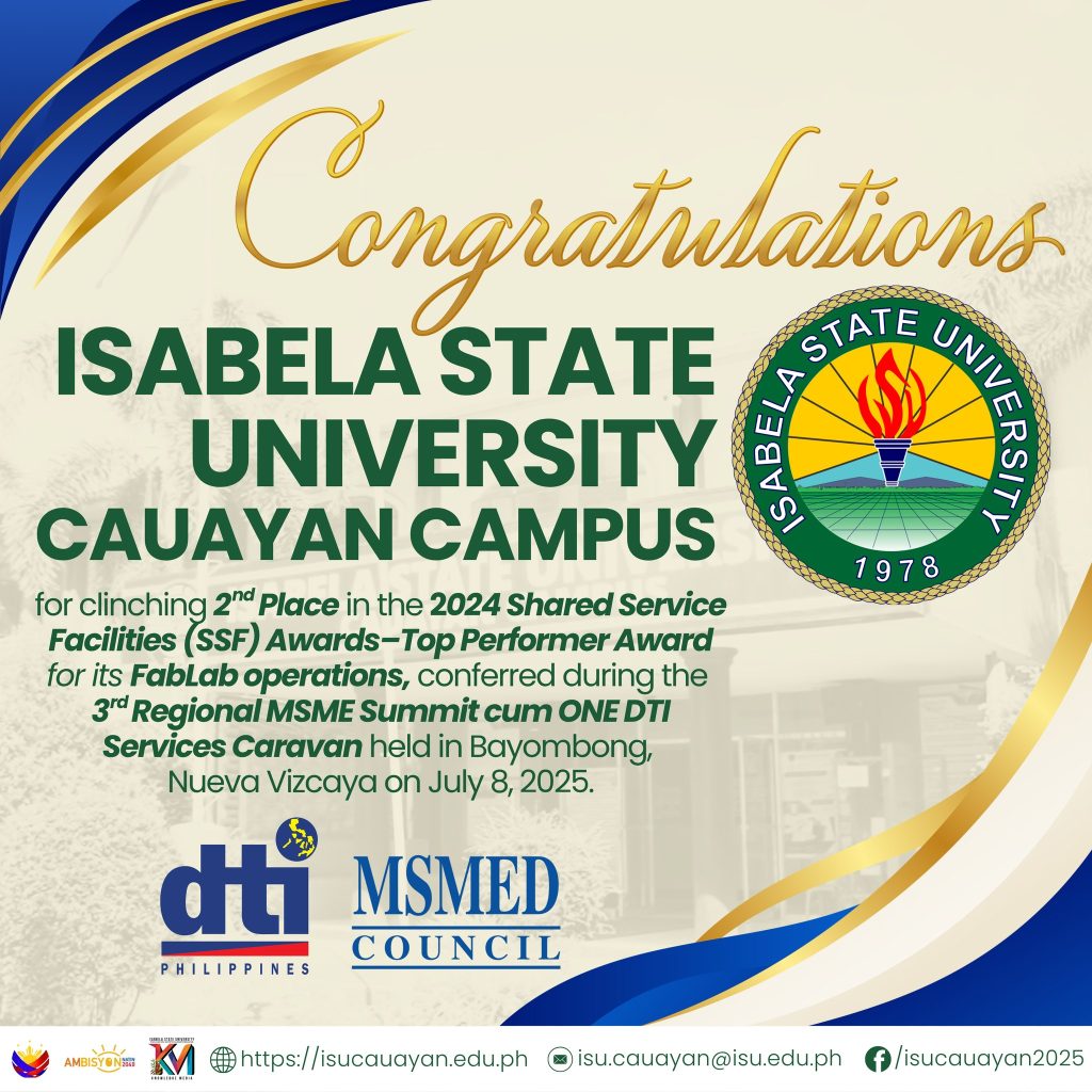 Isabela State UniversityโCauayan Campus added another feather to its cap as it clinched 2nd Place in the 2024 Shared Service Facilities (SSF) Awards โ Top Performer Award for its Fabrication Laboratory (FabLab) operations.