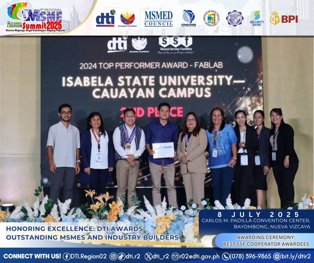 The FabLab of ISU-Cauayan was recognized for its outstanding performance and sustained efforts in innovation, community service, and support for local entrepreneurs. Operated in partnership with the Department of Trade and Industry (DTI), the facility continues to serve as a hub for digital fabrication, prototyping, and skills training for MSMEs in the region.