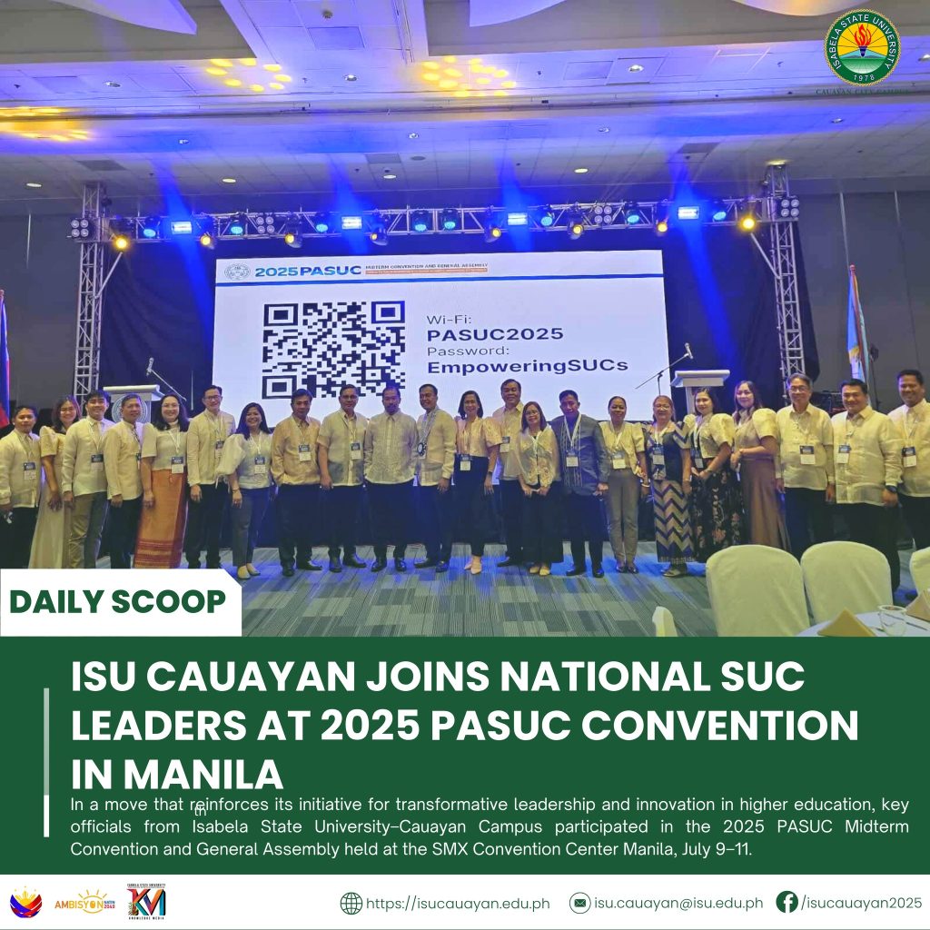 In a move that reinforces its initiative for transformative leadership and innovation in higher education, key officials from Isabela State UniversityโCauayan Campus participated in the 2025 PASUC Midterm Convention and General Assembly held at the SMX Convention Center Manila, July 9โ11.