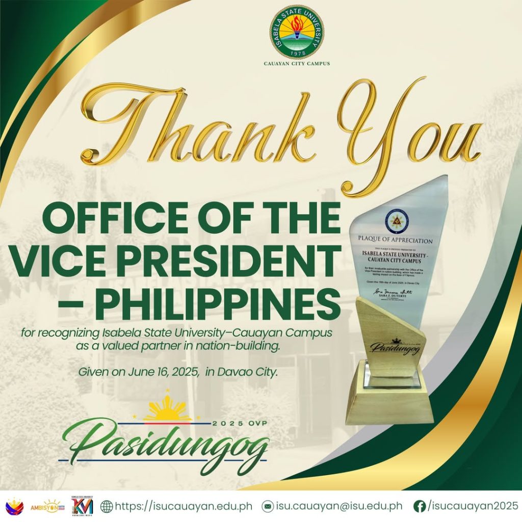 We humbly thank the ππππ’ππ π¨π ππ‘π ππ’ππ ππ«ππ¬π’πππ§π π¨π ππ‘π ππ‘π’π₯π’π©π©π’π§ππ¬ for recognizing Isabela State UniversityβCauayan Campus as a valued partner in nation-building.