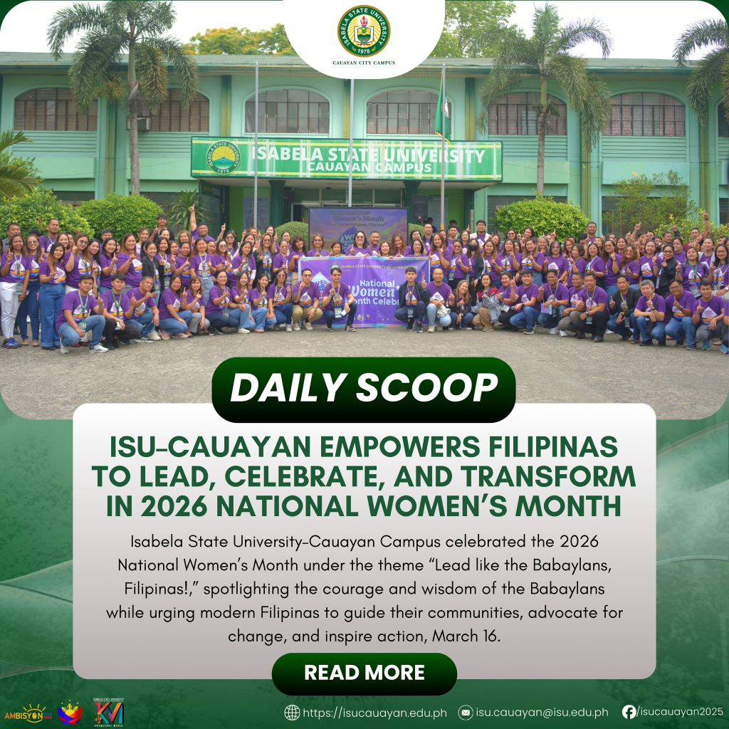Isabela State UniversityโCauayan Campus celebrated the 2026 National Womenโs Month under the theme โLead like the Babaylans, Filipinas!,โ spotlighting the courage and wisdom of the Babaylans while urging modern Filipinas to guide their communities, advocate for change, and inspire action, March 16.