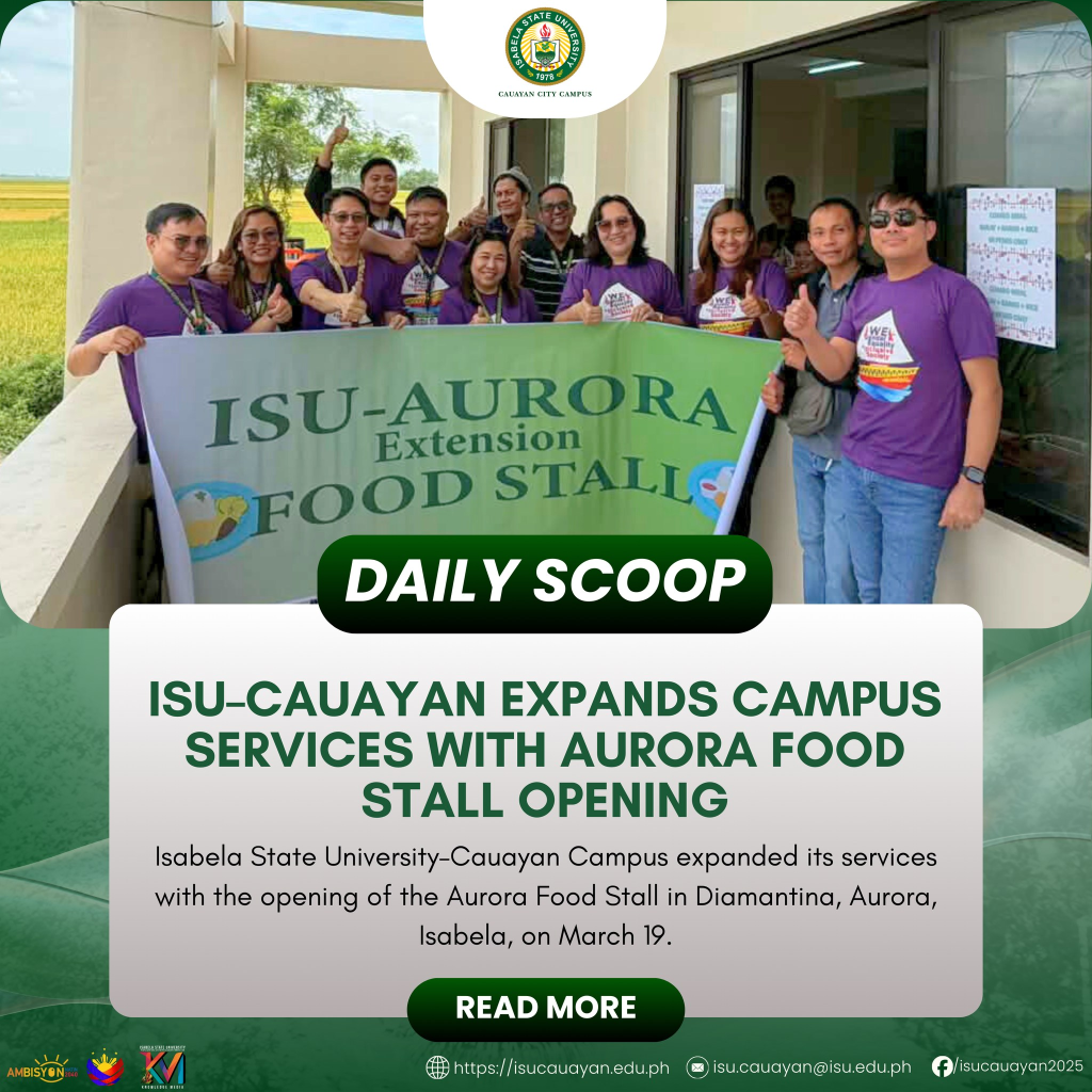 Isabela State UniversityโCauayan Campus expanded its services with the opening of the Aurora Food Stall in Diamantina, Aurora, Isabela, on March 19.