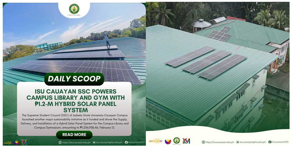 The Supreme Student Council (SSC) of Isabela State UniversityโCauayan Campus launched another major sustainability initiative as it funded and drove the Supply, Delivery, and Installation of a Hybrid Solar Panel System for the Campus Library and Campus Gymnasium, amounting to โฑ1,206,938.46, February 12. The project bolsters the SSCโs efforts to promote renewable energy and cultivate continue reading : ๐๐๐๐๐๐ ๐๐๐๐๐ โฎ ๐๐๐ ๐๐๐ฎ๐๐ฒ๐๐ง ๐๐๐ ๐๐จ๐ฐ๐๐ซ๐ฌ ๐๐๐ฆ๐ฉ๐ฎ๐ฌ ๐๐ข๐๐ซ๐๐ซ๐ฒ ๐๐ง๐ ๐๐ฒ๐ฆ ๐ฐ๐ข๐ญ๐ก โฑ๐.๐-๐ ๐๐ฒ๐๐ซ๐ข๐ ๐๐จ๐ฅ๐๐ซ ๐๐๐ง๐๐ฅ ๐๐ฒ๐ฌ๐ญ๐๐ฆ