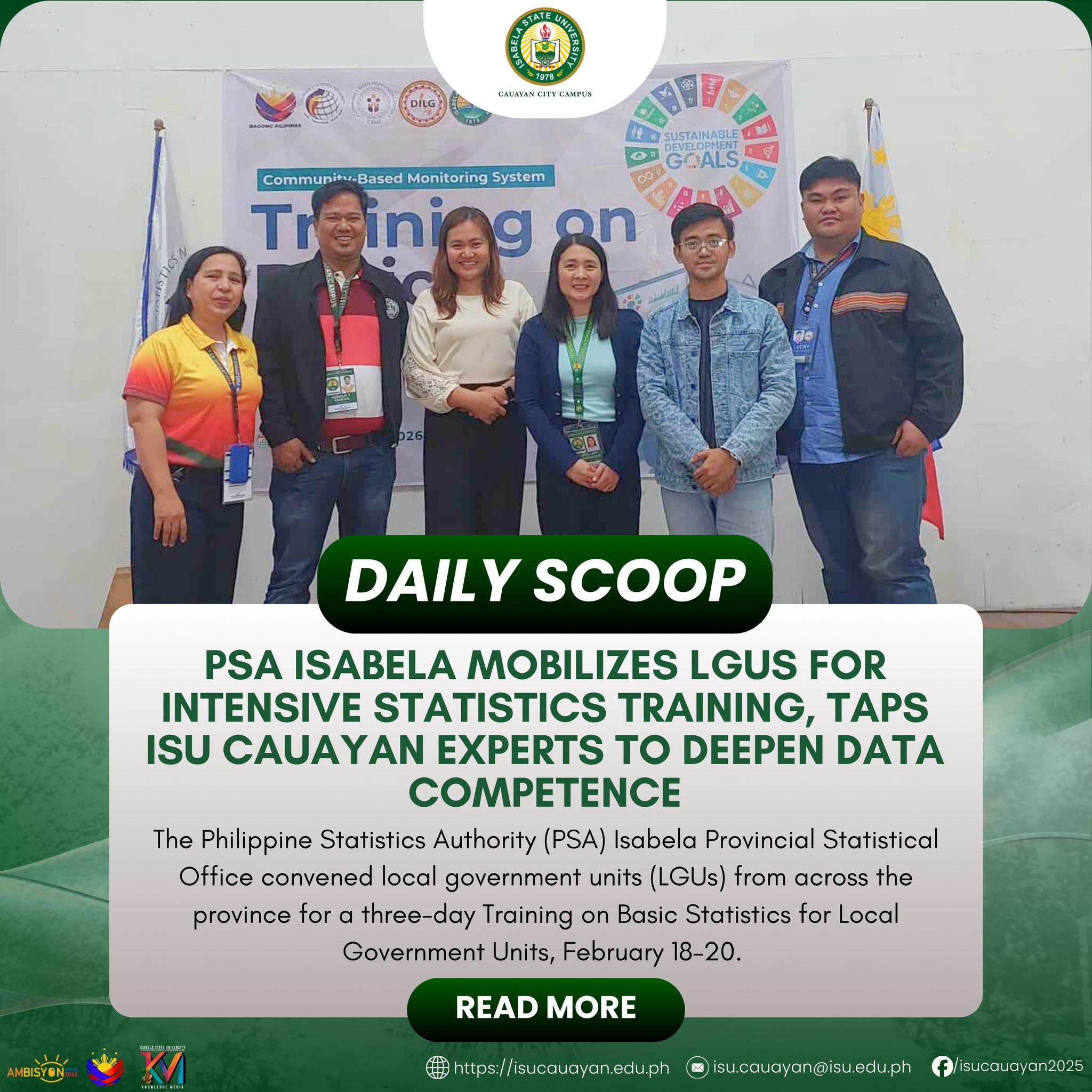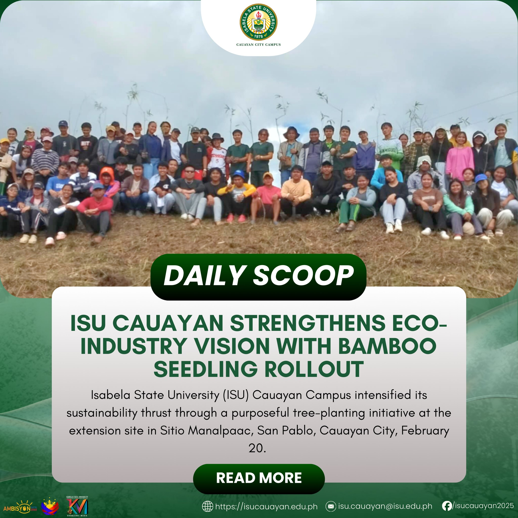 Isabela State University (ISU) Cauayan Campus intensified its sustainability thrust through a purposeful tree-planting initiative at the extension site in Sitio Manalpaac, San Pablo, Cauayan City, February 20. The activity mobilized Bachelor of Agricultural Technology (BAT) fourth-year students alongside faculty members from the Institute of Agricultural Technology (IAT), deepening the campus’ advocacy for environmental protection continue reading : ๐๐๐๐๐๐ ๐๐๐๐๐โฎ ๐๐๐ ๐๐๐ฎ๐๐ฒ๐๐ง ๐๐ญ๐ซ๐๐ง๐ ๐ญ๐ก๐๐ง๐ฌ ๐๐๐จ-๐๐ง๐๐ฎ๐ฌ๐ญ๐ซ๐ฒ ๐๐ข๐ฌ๐ข๐จ๐ง ๐ฐ๐ข๐ญ๐ก ๐๐๐ฆ๐๐จ๐จ ๐๐๐๐๐ฅ๐ข๐ง๐ ๐๐จ๐ฅ๐ฅ๐จ๐ฎ๐ญ