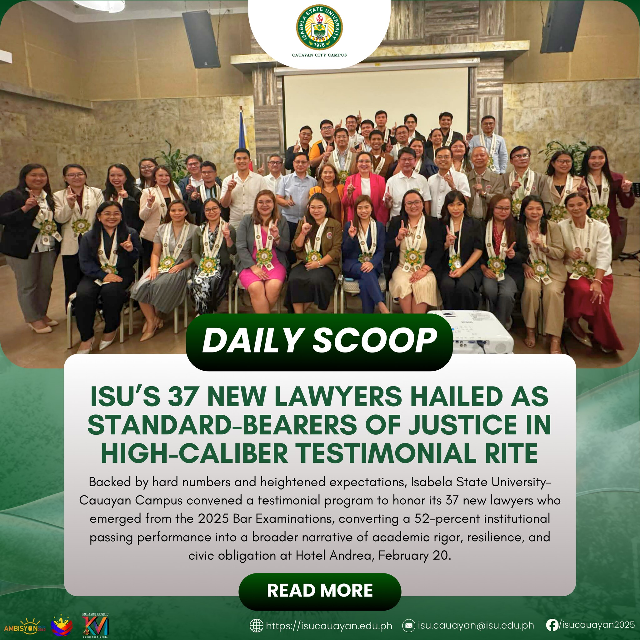 Backed by hard numbers and heightened expectations, Isabela State University-Cauayan Campus convened a testimonial program to honor its 37 new lawyers who emerged from the 2025 Bar Examinations, converting a 52-percent institutional passing performance into a broader narrative of academic rigor, resilience, and civic obligation at Hotel Andrea, February 20. The ceremony convened a formidable continue reading : ๐๐๐๐๐๐ ๐๐๐๐๐โฎ ๐๐๐โ๐ฌ ๐๐ ๐๐๐ฐ ๐๐๐ฐ๐ฒ๐๐ซ๐ฌ ๐๐๐ข๐ฅ๐๐ ๐๐ฌ ๐๐ญ๐๐ง๐๐๐ซ๐-๐๐๐๐ซ๐๐ซ๐ฌ ๐จ๐ ๐๐ฎ๐ฌ๐ญ๐ข๐๐ ๐ข๐ง ๐๐ข๐ ๐ก-๐๐๐ฅ๐ข๐๐๐ซ ๐๐๐ฌ๐ญ๐ข๐ฆ๐จ๐ง๐ข๐๐ฅ ๐๐ข๐ญ๐