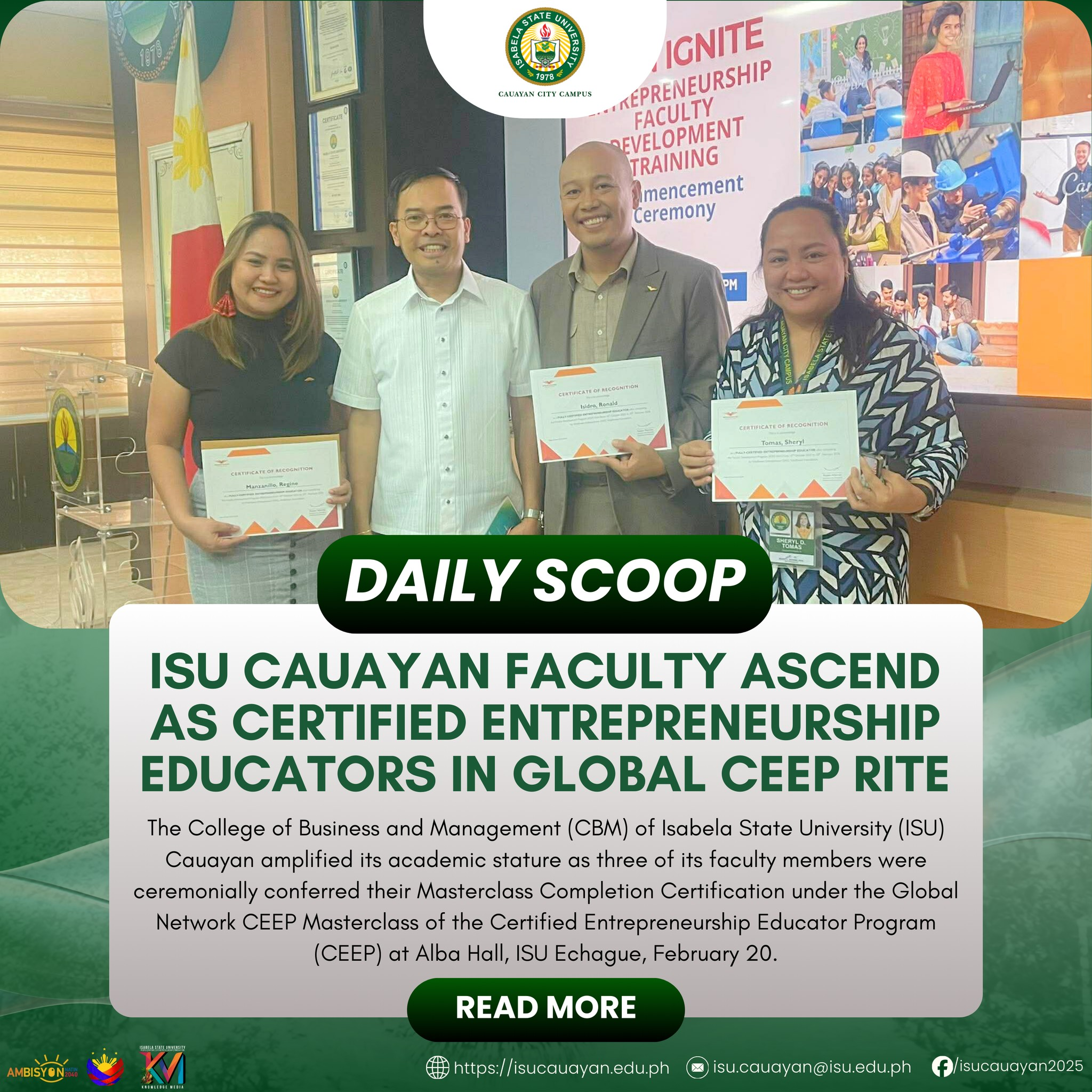 The College of Business and Management (CBM) of Isabela State University (ISU) Cauayan amplified its academic stature as three of its faculty members were ceremonially conferred their Masterclass Completion Certification under the Global Network CEEP Masterclass of the Certified Entrepreneurship Educator Program (CEEP) at Alba Hall, ISU Echague, February 20. The conferment sealed the completion continue reading : ๐๐๐๐๐๐ ๐๐๐๐๐โฎ ๐๐๐ ๐๐๐ฎ๐๐ฒ๐๐ง ๐ ๐๐๐ฎ๐ฅ๐ญ๐ฒ ๐๐ฌ๐๐๐ง๐ ๐๐ฌ ๐๐๐ซ๐ญ๐ข๐๐ข๐๐ ๐๐ง๐ญ๐ซ๐๐ฉ๐ซ๐๐ง๐๐ฎ๐ซ๐ฌ๐ก๐ข๐ฉ ๐๐๐ฎ๐๐๐ญ๐จ๐ซ๐ฌ ๐ข๐ง ๐๐ฅ๐จ๐๐๐ฅ ๐๐๐๐ ๐๐ข๐ญ๐