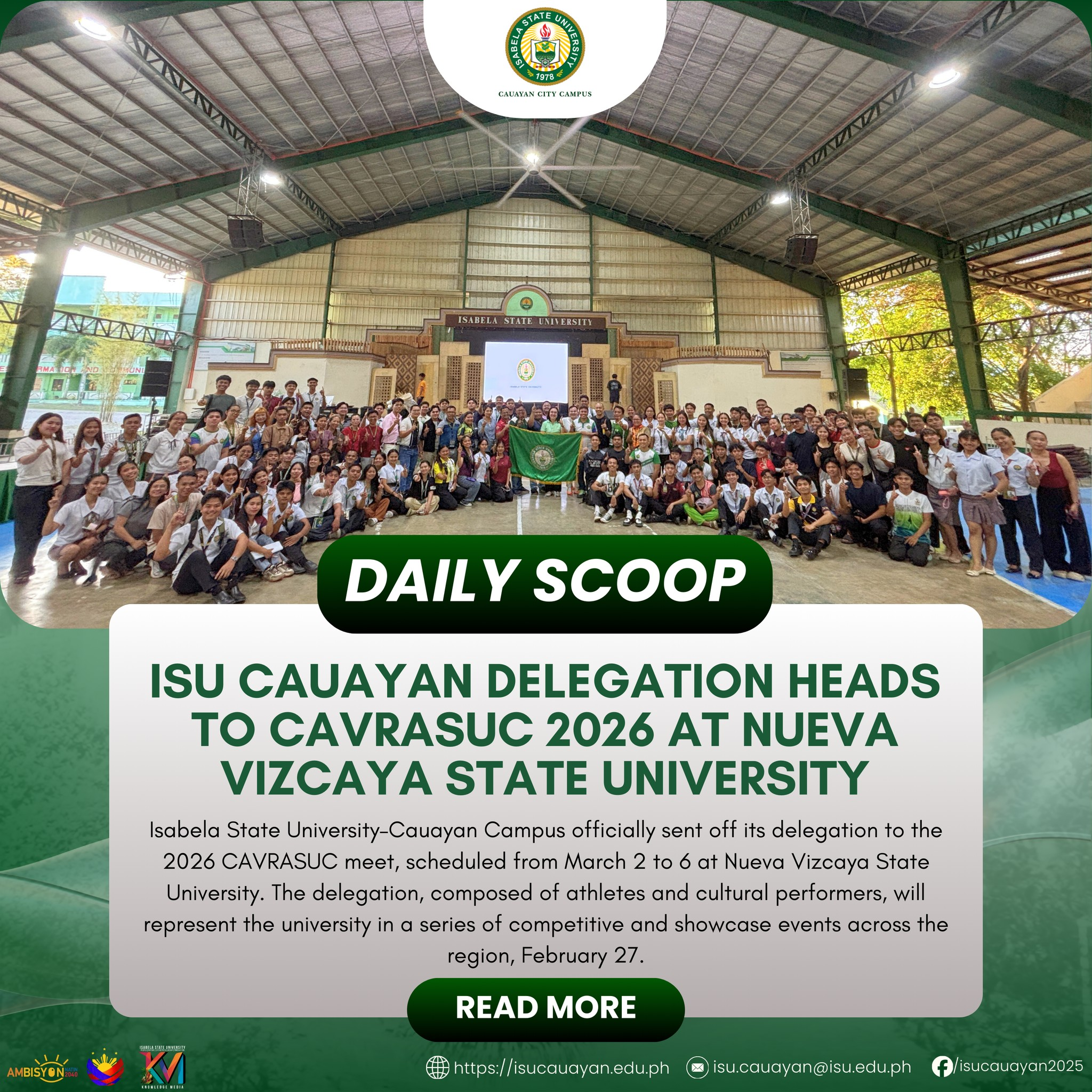 Isabela State UniversityโCauayan Campus officially sent off its delegation to the 2026 CAVRASUC meet, scheduled from March 2 to 6 at Nueva Vizcaya State University. The delegation, composed of athletes and cultural performers, will represent the university in a series of competitive and showcase events across the region, February 27. Leading the team were Prof. continue reading : ๐๐๐๐๐๐ ๐๐๐๐๐โฎ ๐๐๐ ๐๐๐ฎ๐๐ฒ๐๐ง ๐๐๐ฅ๐๐ ๐๐ญ๐ข๐จ๐ง ๐๐๐๐๐ฌ ๐ญ๐จ ๐๐๐๐๐๐๐๐ ๐๐๐๐ ๐๐ญ ๐๐ฎ๐๐ฏ๐ ๐๐ข๐ณ๐๐๐ฒ๐ ๐๐ญ๐๐ญ๐ ๐๐ง๐ข๐ฏ๐๐ซ๐ฌ๐ข๐ญ๐ฒ