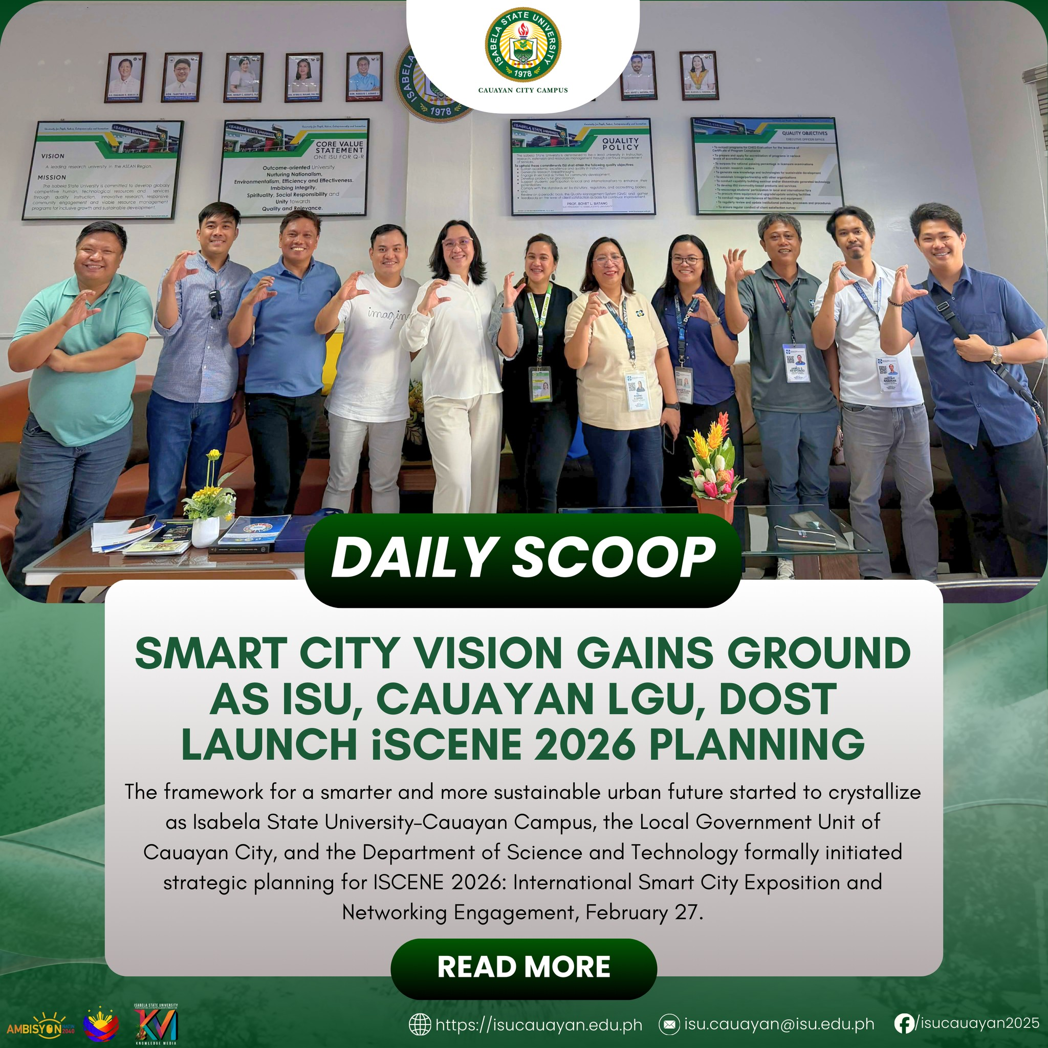 The framework for a smarter and more sustainable urban future started to crystallize as Isabela State UniversityโCauayan Campus, the Local Government Unit of Cauayan City, and the Department of Science and Technology formally initiated strategic planning for ISCENE 2026: International Smart City Exposition and Networking Engagement, February 27. Set on April 9โ11, 2026 at the continue reading : ๐๐๐๐๐๐ ๐๐๐๐๐โฎ ๐๐ฆ๐๐ซ๐ญ ๐๐ข๐ญ๐ฒ ๐๐ข๐ฌ๐ข๐จ๐ง ๐๐๐ข๐ง๐ฌ ๐๐ซ๐จ๐ฎ๐ง๐ ๐๐ฌ ๐๐๐, ๐๐๐ฎ๐๐ฒ๐๐ง ๐๐๐, ๐๐๐๐ ๐๐๐ฎ๐ง๐๐ก ๐ข๐๐๐๐๐ ๐๐๐๐ ๐๐ฅ๐๐ง๐ง๐ข๐ง๐