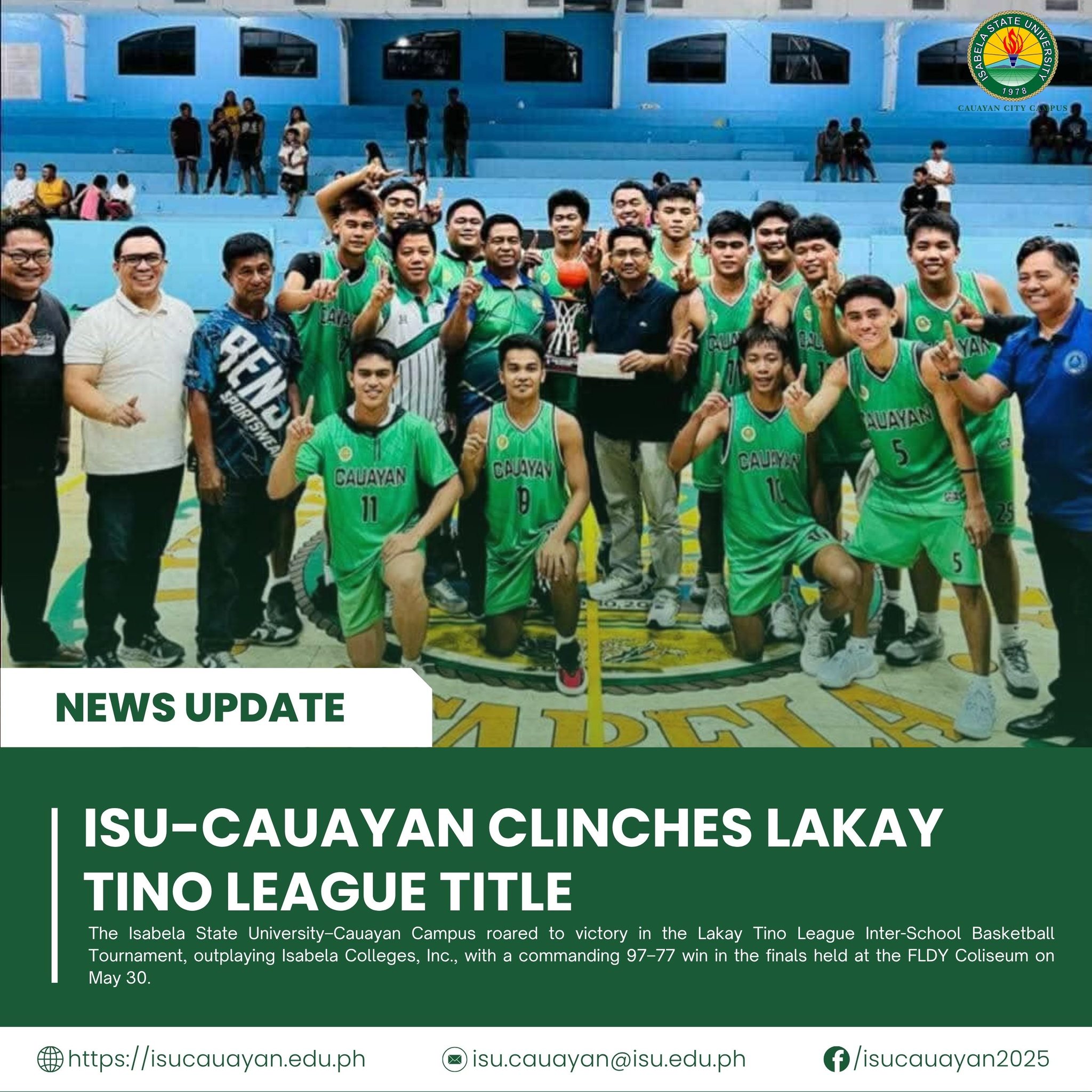 May 30, 2025 The Isabela State UniversityโCauayan Campus roared to victory in the Lakay Tino League Inter-School Basketball Tournament, outplaying Isabela Colleges, Inc., with a commanding 97โ77 win in the finals held at the FLDY Coliseum on May 30. From tipoff to buzzer, the ISU dribblers dictated the tempo, showcasing precision shooting, airtight defense, and continue reading : ๐๐๐-๐๐๐ฎ๐๐ฒ๐๐ง ๐๐ฅ๐ข๐ง๐๐ก๐๐ฌ ๐๐๐ค๐๐ฒ ๐๐ข๐ง๐จ ๐๐๐๐ ๐ฎ๐ ๐๐ข๐ญ๐ฅ๐
