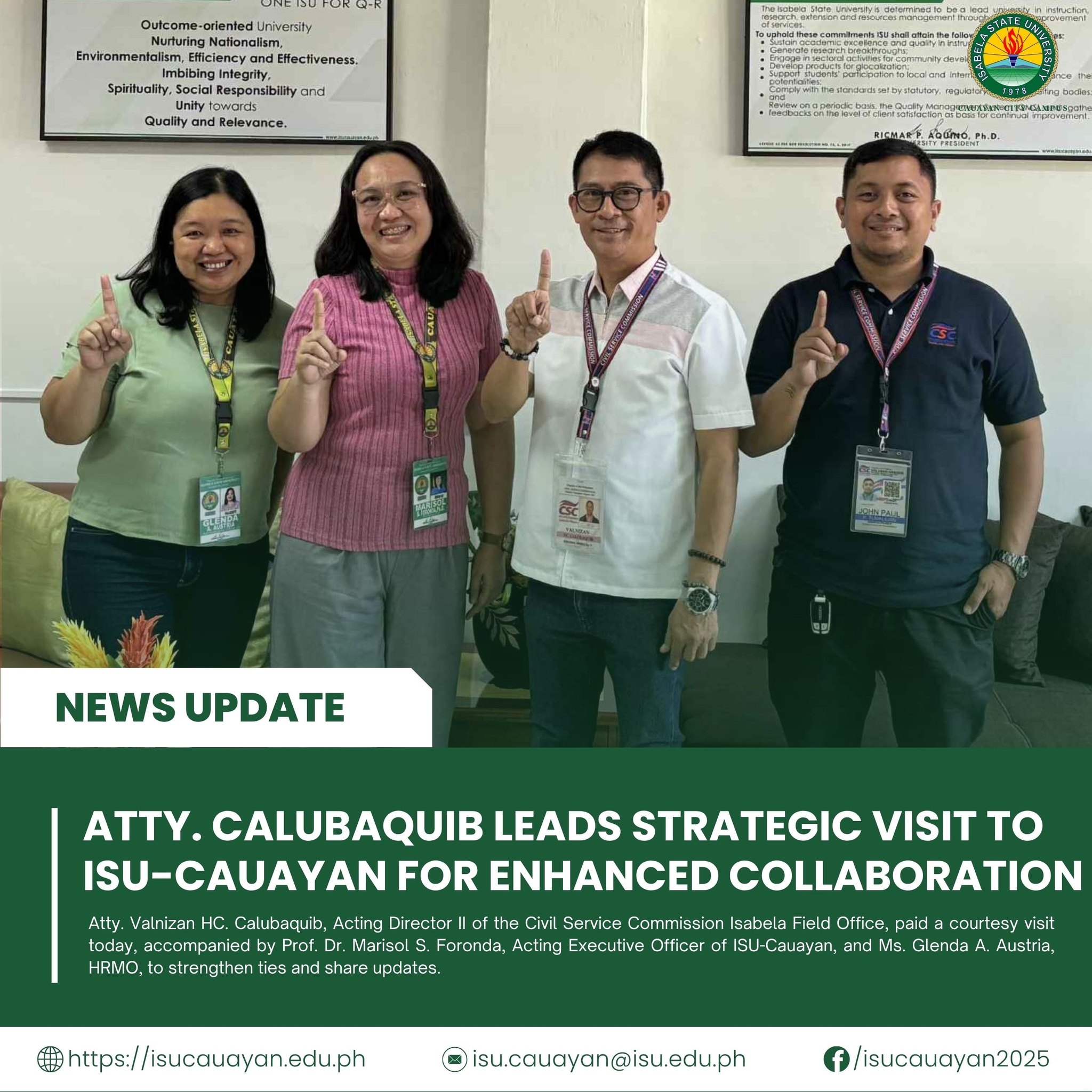 June 3, 2025 Atty. Valnizan HC. Calubaquib, Acting Director II of the Civil Service Commission Isabela Field Office, paid a courtesy visit today, accompanied by Prof. Dr. Marisol S. Foronda, Acting Executive Officer of ISU-Cauayan, and Ms. Glenda A. Austria, HRMO, to strengthen ties and share updates. #OneISU #OneTeamBamboo #CourtesyVisit #CivilServiceCommission #IsabelaFieldOffice