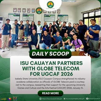 Isabela State University (ISU) Cauayan Campus strengthened its industryโacademe collaboration as officials of GLOBE Telecom paid a courtesy visit to the campus, reasserting their support for the upcoming University Games and Culture and the Arts Festival (UGCAF) 2026, January 15. The delegation was led by Dr. Darius Jose Delgado, Chief Commercial Officer, and Ms. Evelyn continue reading : ๐๐๐๐๐๐ ๐๐๐๐๐โฎ ๐๐๐ ๐๐๐ฎ๐๐ฒ๐๐ง ๐๐๐ซ๐ญ๐ง๐๐ซ๐ฌ ๐ฐ๐ข๐ญ๐ก ๐๐๐๐๐ ๐๐๐ฅ๐๐๐จ๐ฆ ๐๐จ๐ซ ๐๐๐๐๐ ๐๐๐๐