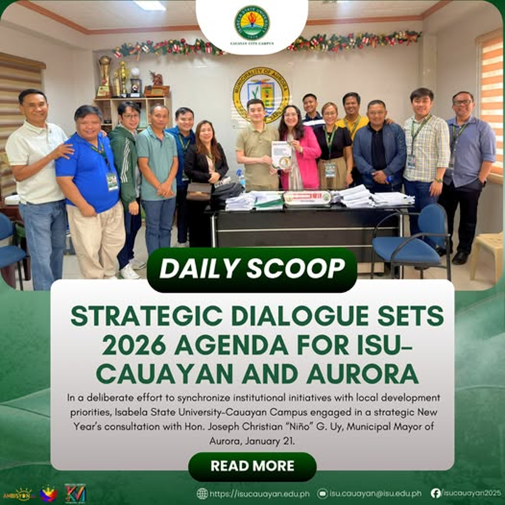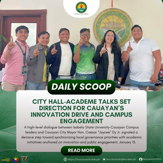 A high-level dialogue between Isabela State UniversityโCauayan Campus leaders and Cauayan City Mayor Hon. Caesar โJayceeโ S. Dy Jr. signaled a decisive step toward synchronizing local governance priorities with academic initiatives anchored on innovation and public engagement, January 13. The meeting tackled the convergence of the cityโs forward-looking development agenda and the universityโs thrusts in continue reading : ๐๐๐๐๐๐ ๐๐๐๐๐โฎ ๐๐ข๐ญ๐ฒ ๐๐๐ฅ๐ฅโ๐๐๐๐๐๐ฆ๐ ๐๐๐ฅ๐ค๐ฌ ๐๐๐ญ ๐๐ข๐ซ๐๐๐ญ๐ข๐จ๐ง ๐๐จ๐ซ ๐๐๐ฎ๐๐ฒ๐๐งโ๐ฌ ๐๐ง๐ง๐จ๐ฏ๐๐ญ๐ข๐จ๐ง ๐๐ซ๐ข๐ฏ๐ ๐๐ง๐ ๐๐๐ฆ๐ฉ๐ฎ๐ฌ ๐๐ง๐ ๐๐ ๐๐ฆ๐๐ง๐ญ