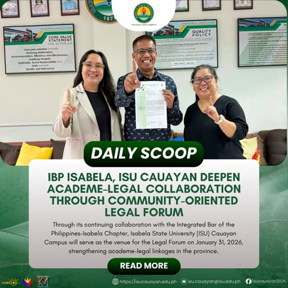 Through its continuing collaboration with the Integrated Bar of the PhilippinesโIsabela Chapter, Isabela State University (ISU) Cauayan Campus will serve as the venue for the Legal Forum on January 31, 2026, strengthening academeโlegal linkages in the province. Carrying the theme โPaglinang ng Kakayahan ng mga Abogado sa Nagbabagong Panahon ng Batas at Hustisya,โ the forum continue reading : ๐๐๐๐๐๐ ๐๐๐๐๐โฎ ๐๐๐ ๐๐ฌ๐๐๐๐ฅ๐, ๐๐๐ ๐๐๐ฎ๐๐ฒ๐๐ง ๐๐๐๐ฉ๐๐ง ๐๐๐๐๐๐ฆ๐โ๐๐๐ ๐๐ฅ ๐๐จ๐ฅ๐ฅ๐๐๐จ๐ซ๐๐ญ๐ข๐จ๐ง ๐๐ก๐ซ๐จ๐ฎ๐ ๐ก ๐๐จ๐ฆ๐ฆ๐ฎ๐ง๐ข๐ญ๐ฒ-๐๐ซ๐ข๐๐ง๐ญ๐๐ ๐๐๐ ๐๐ฅ ๐ ๐จ๐ซ๐ฎ๐ฆ
