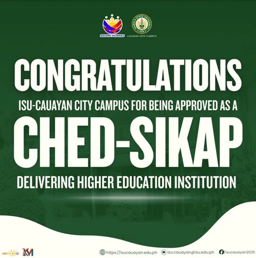 We are pleased to announce that Isabela State University โ Cauayan City Campus has been officially approved by CHED Regional Office II as a Delivering Higher Education Institution (DHEI) under the Scholarship for Staff and Instructorsโ Knowledge Advancement Program (SIKAP). This milestone highlights ISU Cauayanโs commitment to quality graduate education and faculty development, reinforcing its continue reading : ๐๐๐-๐๐๐๐๐๐๐ ๐๐๐๐ ๐๐๐๐๐๐ ๐๐ ๐๐๐ ๐ ๐๐๐๐-๐๐๐๐๐ ๐๐๐๐