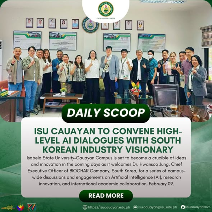 Isabela State UniversityโCauayan Campus is set to become a crucible of ideas and innovation in the coming days as it welcomes Dr. Hwansoo Jung, Chief Executive Officer of BIOCHAR Company, South Korea, for a series of campus-wide discussions and engagements on Artificial Intelligence (AI), research innovation, and international academic collaboration, February 09. The visit is continue reading : ๐๐๐๐๐๐ ๐๐๐๐๐โฎ ๐๐๐ ๐๐๐ฎ๐๐ฒ๐๐ง ๐ญ๐จ ๐๐จ๐ง๐ฏ๐๐ง๐ ๐๐ข๐ ๐ก-๐๐๐ฏ๐๐ฅ ๐๐ ๐๐ข๐๐ฅ๐จ๐ ๐ฎ๐๐ฌ ๐ฐ๐ข๐ญ๐ก ๐๐จ๐ฎ๐ญ๐ก ๐๐จ๐ซ๐๐๐ง ๐๐ง๐๐ฎ๐ฌ๐ญ๐ซ๐ฒ ๐๐ข๐ฌ๐ข๐จ๐ง๐๐ซ๐ฒ