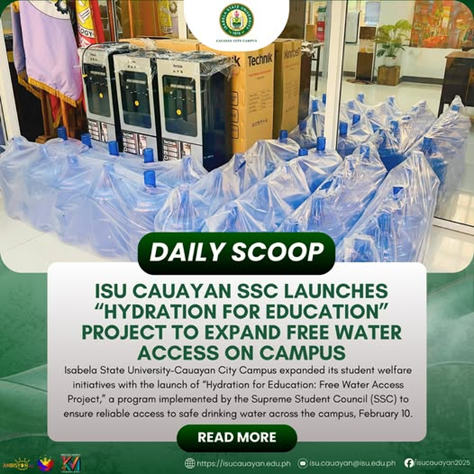 Isabela State UniversityโCauayan City Campus expanded its student welfare initiatives with the launch of โHydration for Education: Free Water Access Project,โ a program implemented by the Supreme Student Council (SSC) to ensure reliable access to safe drinking water across the campus, February 10. The project installed free water stations in high-traffic and student-centered areas, including continue reading : ๐๐๐๐๐๐ ๐๐๐๐๐โฎ ๐๐๐ ๐๐๐ฎ๐๐ฒ๐๐ง ๐๐๐ ๐๐๐ฎ๐ง๐๐ก๐๐ฌ โ๐๐ฒ๐๐ซ๐๐ญ๐ข๐จ๐ง ๐๐จ๐ซ ๐๐๐ฎ๐๐๐ญ๐ข๐จ๐งโ ๐๐ซ๐จ๐ฃ๐๐๐ญ ๐ญ๐จ ๐๐ฑ๐ฉ๐๐ง๐ ๐ ๐ซ๐๐ ๐๐๐ญ๐๐ซ ๐๐๐๐๐ฌ๐ฌ ๐จ๐ง ๐๐๐ฆ๐ฉ๐ฎ๐ฌ