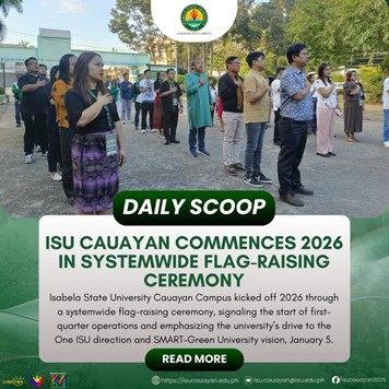 Isabela State University Cauayan Campus kicked off 2026 through a systemwide flag-raising ceremony on January 5, signaling the start of first-quarter operations and emphasizing the universityโs drive to the One ISU direction and SMARTโGreen University vision, January 5. Faculty and staff gathered for the activity, which fortified the campus’ roles in instruction, research, extension, and continue reading : ๐๐๐๐๐๐ ๐๐๐๐๐โฎ ๐๐๐ ๐๐๐ฎ๐๐ฒ๐๐ง ๐๐จ๐ฆ๐ฆ๐๐ง๐๐๐ฌ ๐๐๐๐ ๐ข๐ง ๐๐ฒ๐ฌ๐ญ๐๐ฆ๐ฐ๐ข๐๐ ๐ ๐ฅ๐๐ -๐๐๐ข๐ฌ๐ข๐ง๐ ๐๐๐ซ๐๐ฆ๐จ๐ง๐ฒ