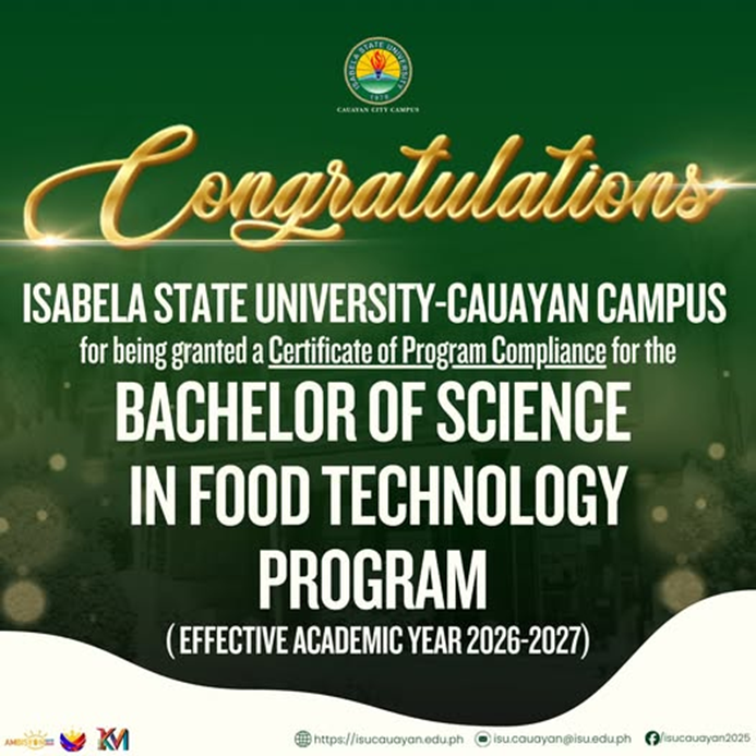 Isabela State UniversityโCauayan Campus has been granted a Certificate of Program Compliance (COPC) by the Commission on Higher Education (CHED), authorizing the institution to operate the Bachelor of Science in Food Technology program beginning Academic Year 2026โ2027. The approval, issued as COPC No. 028, Series of 2025, was conferred in accordance with Republic Act No. continue reading : ๐๐๐๐๐๐ ๐๐๐๐๐๐๐๐๐๐๐โฎ ๐๐๐ ๐๐๐ฎ๐๐ฒ๐๐ง ๐๐๐๐ฎ๐ซ๐๐ฌ ๐๐๐๐ ๐๐ฉ๐ฉ๐ซ๐จ๐ฏ๐๐ฅ ๐ญ๐จ ๐๐๐๐๐ซ ๐๐ ๐ ๐จ๐จ๐ ๐๐๐๐ก๐ง๐จ๐ฅ๐จ๐ ๐ฒ ๐๐ญ๐๐ซ๐ญ๐ข๐ง๐ ๐๐ ๐๐๐๐โ๐๐๐๐