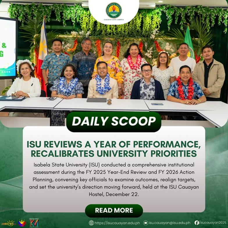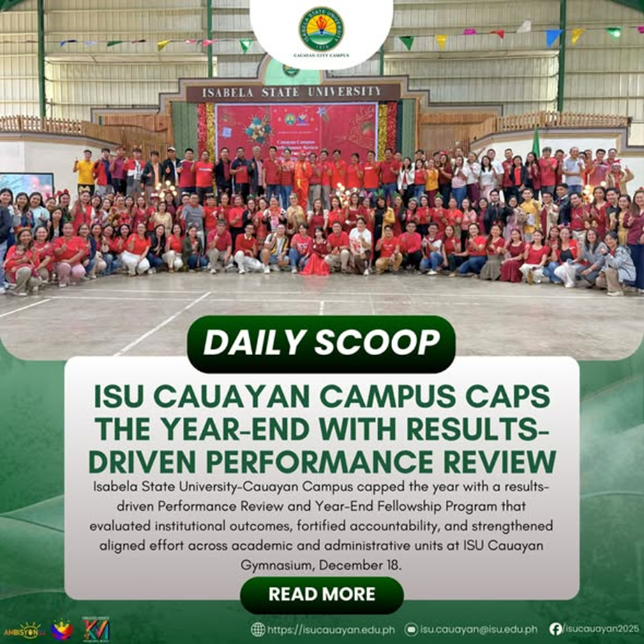 Isabela State UniversityโCauayan Campus capped the year with a results-driven Performance Review and Year-End Fellowship Program that evaluated institutional outcomes, fortified accountability, and strengthened aligned effort across academic and administrative units at ISU Cauayan Gymnasium, December 18. The year-end activity was graced by University President IV Prof. Dr. Boyet L. Batang, together with Prof. Dr. continue reading : ๐๐๐๐๐๐ ๐๐๐๐๐โฎ ๐๐๐ ๐๐๐ฎ๐๐ฒ๐๐ง ๐๐๐ฆ๐ฉ๐ฎ๐ฌ ๐๐๐ฉ๐ฌ ๐ญ๐ก๐ ๐๐๐๐ซ-๐๐ง๐ ๐ฐ๐ข๐ญ๐ก ๐๐๐ฌ๐ฎ๐ฅ๐ญ๐ฌ-๐๐ซ๐ข๐ฏ๐๐ง ๐๐๐ซ๐๐จ๐ซ๐ฆ๐๐ง๐๐ ๐๐๐ฏ๐ข๐๐ฐ