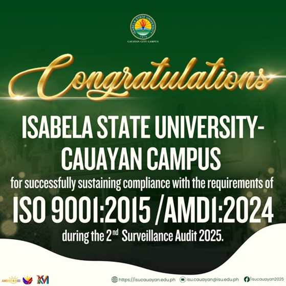Isabela State UniversityโCauayan Campus successfully maintained its ISO 9001:2015/AMD1:2024 certification following the completion of the 2nd Surveillance Audit for 2025, December 19. The audit assessed the campusโ Quality Management System (QMS), Environmental Management System (EMS), and Occupational Health and Safety Management System (OHSMS), confirming the institutionโs adherence to international standards and operational excellence. Notably, no continue reading : ๐๐๐๐๐๐ ๐๐๐๐๐โฎ ๐๐๐ ๐๐๐ฎ๐๐ฒ๐๐ง ๐๐๐ข๐ง๐ญ๐๐ข๐ง๐ฌ ๐๐๐ ๐๐๐๐:๐๐๐๐/๐๐๐๐:๐๐๐๐ ๐๐๐ซ๐ญ๐ข๐๐ข๐๐๐ญ๐ข๐จ๐ง ๐ข๐ง ๐๐ง๐ ๐๐ฎ๐ซ๐ฏ๐๐ข๐ฅ๐ฅ๐๐ง๐๐ ๐๐ฎ๐๐ข๐ญ