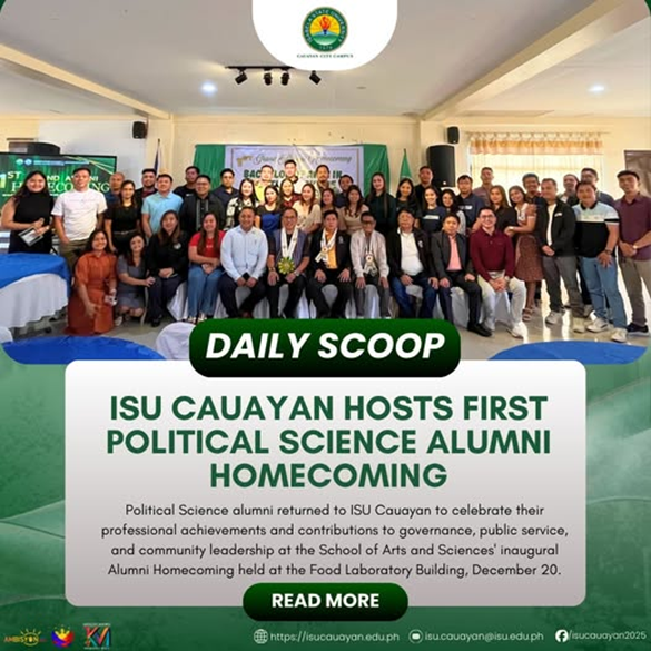 Political Science alumni returned to ISU Cauayan to celebrate their professional achievements and contributions to governance, public service, and community leadership at the School of Arts and Sciences’ inaugural Alumni Homecoming held at the Food Laboratory Building, December 20. Under the theme โBridging Generations, Building Legacies,โ the event brought together graduates from Batch 2007 to continue reading : ๐๐๐๐๐๐ ๐๐๐๐๐โฎ ๐๐๐ ๐๐๐ฎ๐๐ฒ๐๐ง ๐๐จ๐ฌ๐ญ๐ฌ ๐ ๐ข๐ซ๐ฌ๐ญ ๐๐จ๐ฅ๐ข๐ญ๐ข๐๐๐ฅ ๐๐๐ข๐๐ง๐๐ ๐๐ฅ๐ฎ๐ฆ๐ง๐ข ๐๐จ๐ฆ๐๐๐จ๐ฆ๐ข๐ง๐
