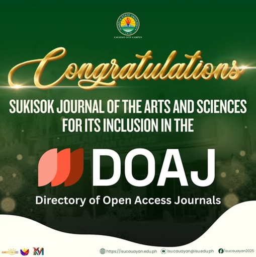Isabela State University (ISU) Cauayan Campus formally lauds the SUKISOK Journal of the Arts and Sciences for securing its place in the Directory of Open Access Journals (DOAJ), a breakthrough that positions it as the first across the entire ISU system to earn inclusion in the globally respected index. DOAJ is internationally regarded as a continue reading : ๐๐๐๐๐๐๐ ๐๐จ๐ฎ๐ซ๐ง๐๐ฅ ๐๐ซ๐๐๐ค๐ฌ ๐๐๐ฐ ๐๐ซ๐จ๐ฎ๐ง๐ ๐ฐ๐ข๐ญ๐ก ๐๐๐๐ ๐๐ง๐๐๐ฑ๐ข๐ง๐ , ๐ ๐ข๐ซ๐ฌ๐ญ ๐๐๐ซ๐จ๐ฌ๐ฌ ๐๐๐ ๐๐ฒ๐ฌ๐ญ๐๐ฆ
