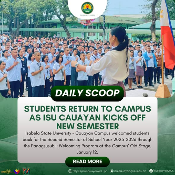 Isabela State University โ Cauayan Campus welcomed students back for the Second Semester of School Year 2025โ2026 through the Panagsusubli: Welcoming Program at the Campus’ Old Stage, January 12. The activity was organized by the Office of the Student Affairs and Services (OSAS) in partnership with the Office of the Supreme Student Council (SSC). The continue reading : ๐๐๐๐๐๐ ๐๐๐๐๐โฎ ๐๐ญ๐ฎ๐๐๐ง๐ญ๐ฌ ๐๐๐ญ๐ฎ๐ซ๐ง ๐ญ๐จ ๐๐๐ฆ๐ฉ๐ฎ๐ฌ ๐๐ฌ ๐๐๐ ๐๐๐ฎ๐๐ฒ๐๐ง ๐๐ข๐๐ค๐ฌ ๐๐๐ ๐๐๐ฐ ๐๐๐ฆ๐๐ฌ๐ญ๐๐ซ