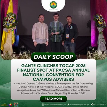 Assoc. Prof. Dionicio D. Gante clinched a finalist spot in the Ten Outstanding Campus Advisers of the Philippines (TOCAP) 2025, earning national recognition during the PACSA Annual National Convention for Campus Advisers held at Teacherโs Camp, Baguio City, November 26โ29. The four-day convention gathered advisers and student leaders from various higher education institutions nationwide and continue reading : ๐๐๐๐๐๐ ๐๐๐๐๐โฎ ๐๐๐ง๐ญ๐ ๐๐ฅ๐ข๐ง๐๐ก๐๐ฌ ๐๐๐๐๐ ๐๐๐๐ ๐ ๐ข๐ง๐๐ฅ๐ข๐ฌ๐ญ ๐๐ฉ๐จ๐ญ ๐๐ญ ๐๐๐๐๐ ๐๐ง๐ง๐ฎ๐๐ฅ ๐๐๐ญ๐ข๐จ๐ง๐๐ฅ ๐๐จ๐ง๐ฏ๐๐ง๐ญ๐ข๐จ๐ง ๐๐จ๐ซ ๐๐๐ฆ๐ฉ๐ฎ๐ฌ ๐๐๐ฏ๐ข๐ฌ๐๐ซ๐ฌ