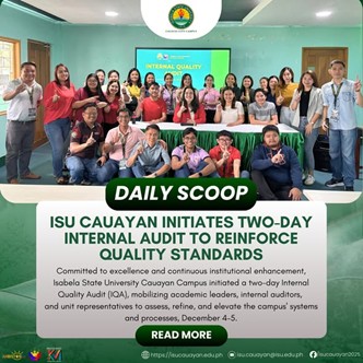 Committed to excellence and continuous institutional enhancement, Isabela State University Cauayan Campus initiated a two-day Internal Quality Audit (IQA), mobilizing academic leaders, internal auditors, and unit representatives to assess, refine, and elevate the campus’ systems and processes, December 4โ5. The opening program featured the message of Prof. Dr. Marisol S. Foronda, Executive Officer, who grounded continue reading : ๐๐๐๐๐๐ ๐๐๐๐๐โฎ ๐๐๐ ๐๐๐ฎ๐๐ฒ๐๐ง ๐๐ง๐ข๐ญ๐ข๐๐ญ๐๐ฌ ๐๐ฐ๐จ-๐๐๐ฒ ๐๐ง๐ญ๐๐ซ๐ง๐๐ฅ ๐๐ฎ๐๐ข๐ญ ๐ญ๐จ ๐๐๐ข๐ง๐๐จ๐ซ๐๐ ๐๐ฎ๐๐ฅ๐ข๐ญ๐ฒ ๐๐ญ๐๐ง๐๐๐ซ๐๐ฌ