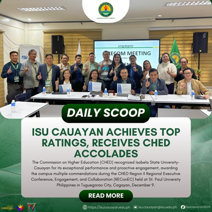 The Commission on Higher Education (CHED) recognized Isabela State UniversityโCauayan for its exceptional performance and proactive engagement, awarding the campus multiple commendations during the CHED Region II Regional Executive Conference, Engagement, and Collaboration (REConEC) held at St. Paul University Philippines in Tuguegarao City, Cagayan, December 9. The recognition highlighted ISU Cauayanโs outstanding performance in licensure continue reading : ๐๐๐๐๐๐ ๐๐๐๐๐โฎ ๐๐๐ ๐๐๐ฎ๐๐ฒ๐๐ง ๐๐๐ก๐ข๐๐ฏ๐๐ฌ ๐๐จ๐ฉ ๐๐๐ญ๐ข๐ง๐ ๐ฌ, ๐๐๐๐๐ข๐ฏ๐๐ฌ ๐๐๐๐ ๐๐๐๐จ๐ฅ๐๐๐๐ฌ