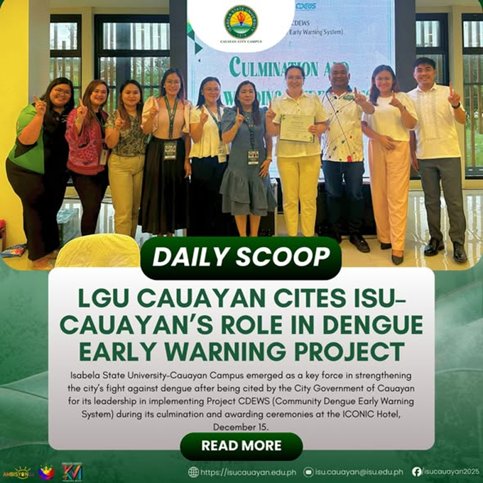 Isabela State UniversityโCauayan Campus emerged as a key force in strengthening the cityโs fight against dengue after being cited by the City Government of Cauayan for its leadership in implementing Project CDEWS (Community Dengue Early Warning System) during its culmination and awarding ceremonies at the ICONIC Hotel, December 15. Project CDEWS is a collaborative initiative continue reading : ๐๐๐๐๐๐ ๐๐๐๐๐โฎ ๐๐๐ ๐๐๐ฎ๐๐ฒ๐๐ง ๐๐ข๐ญ๐๐ฌ ๐๐๐โ๐๐๐ฎ๐๐ฒ๐๐งโ๐ฌ ๐๐จ๐ฅ๐ ๐ข๐ง ๐๐๐ง๐ ๐ฎ๐ ๐๐๐ซ๐ฅ๐ฒ ๐๐๐ซ๐ง๐ข๐ง๐ ๐๐ซ๐จ๐ฃ๐๐๐ญ