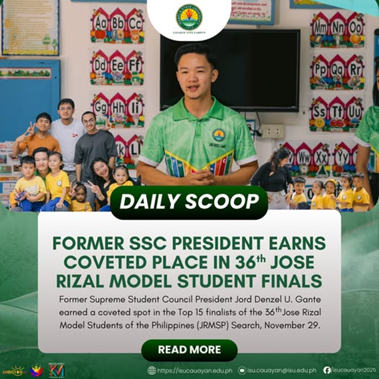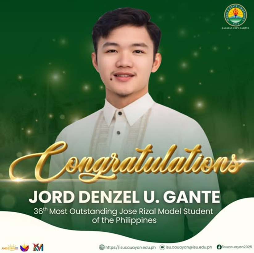 ๐๐๐๐๐๐ ๐๐๐๐๐๐๐๐๐๐๐| Isabela State University Cauayan City Campus hails Jord Denzel U. Gante, former Supreme Student Council President, as he earns distinction as the ๐๐๐ญ๐ก ๐๐จ๐ฌ๐ญ ๐๐ฎ๐ญ๐ฌ๐ญ๐๐ง๐๐ข๐ง๐ ๐๐จ๐ฌ๐ ๐๐ข๐ณ๐๐ฅ ๐๐จ๐๐๐ฅ ๐๐ญ๐ฎ๐๐๐ง๐ญ ๐จ๐ ๐ญ๐ก๐ ๐๐ก๐ข๐ฅ๐ข๐ฉ๐ฉ๐ข๐ง๐๐ฌ during the 63rd National Rizal Youth Leadership Institute with the theme Rizalian LeaderSHAPE: Shaping Heroic Advocacy, Advancing People Empowerment, Vigan City, continue reading : ๐๐๐๐๐๐ ๐๐๐๐๐๐๐๐๐๐๐