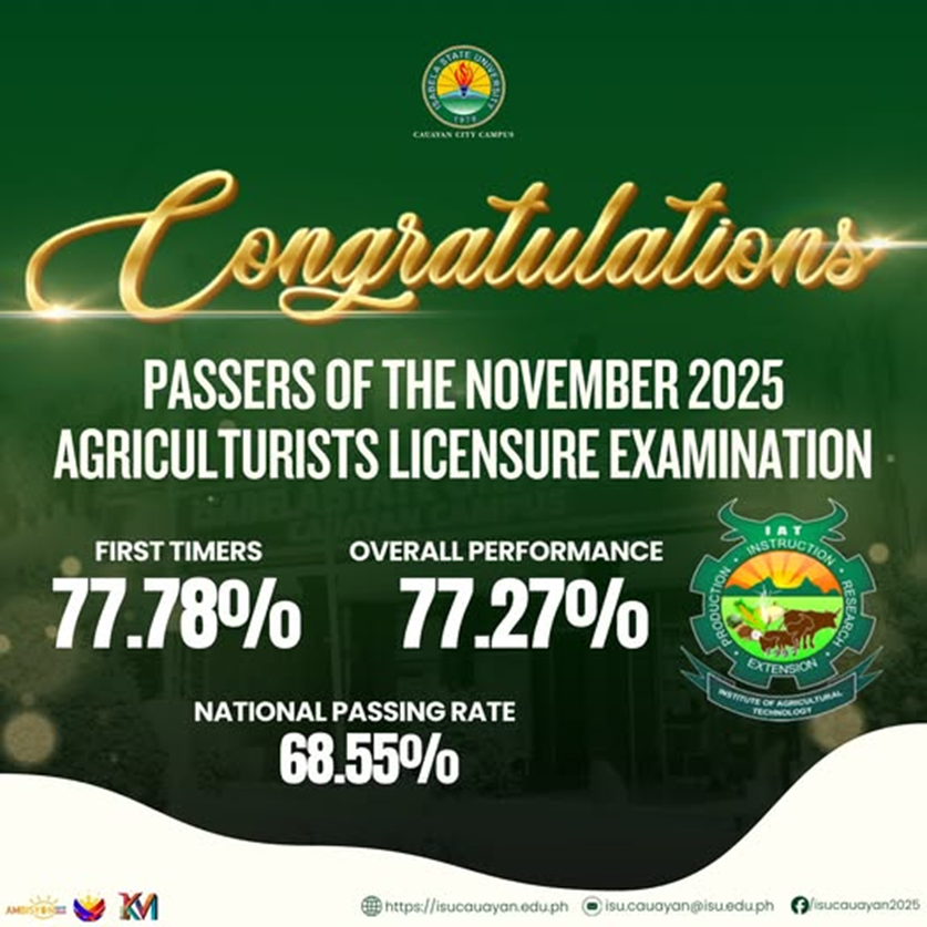 The Isabela State UniversityโCauayan Campus recognizes the Institute of Agricultural Technology for dominating the November 2025 Agriculturists Licensure Examination, with a 77.78% passing rate for first-time examinees and an overall performance of 77.27%, clearly surpassing the national passing rate of 68.55%. This achievement shows the relentless effort of our students, the strategic guidance of our continue reading : ๐๐๐๐๐๐ ๐๐๐๐๐โฎ ๐๐๐ ๐๐ซ๐๐๐ฎ๐๐ญ๐๐ฌ ๐๐ฑ๐๐๐๐ ๐๐๐ญ๐ข๐จ๐ง๐๐ฅ ๐๐๐ฌ๐ฌ๐ข๐ง๐ ๐๐๐ญ๐ ๐ข๐ง ๐๐จ๐ฏ๐๐ฆ๐๐๐ซ ๐๐๐๐ ๐๐ ๐ซ๐ข๐๐ฎ๐ฅ๐ญ๐ฎ๐ซ๐ข๐ฌ๐ญ๐ฌ ๐๐ฑ๐๐ฆ
