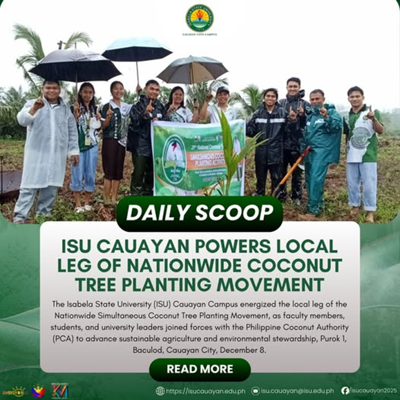 The Isabela State University (ISU) Cauayan Campus energized the local leg of the Nationwide Simultaneous Coconut Tree Planting Movement, as faculty members, students, and university leaders joined forces with the Philippine Coconut Authority (PCA) to advance sustainable agriculture and environmental stewardship, Purok 1, Baculod, Cauayan City, December 8. Aimed at boosting coconut production and rejuvenating continue reading : ๐๐๐๐๐๐ ๐๐๐๐๐โฎ ๐๐๐ ๐๐๐ฎ๐๐ฒ๐๐ง ๐๐จ๐ฐ๐๐ซ๐ฌ ๐๐จ๐๐๐ฅ ๐๐๐ ๐จ๐ ๐๐๐ญ๐ข๐จ๐ง๐ฐ๐ข๐๐ ๐๐จ๐๐จ๐ง๐ฎ๐ญ ๐๐ซ๐๐ ๐๐ฅ๐๐ง๐ญ๐ข๐ง๐ ๐๐จ๐ฏ๐๐ฆ๐๐ง๐ญ