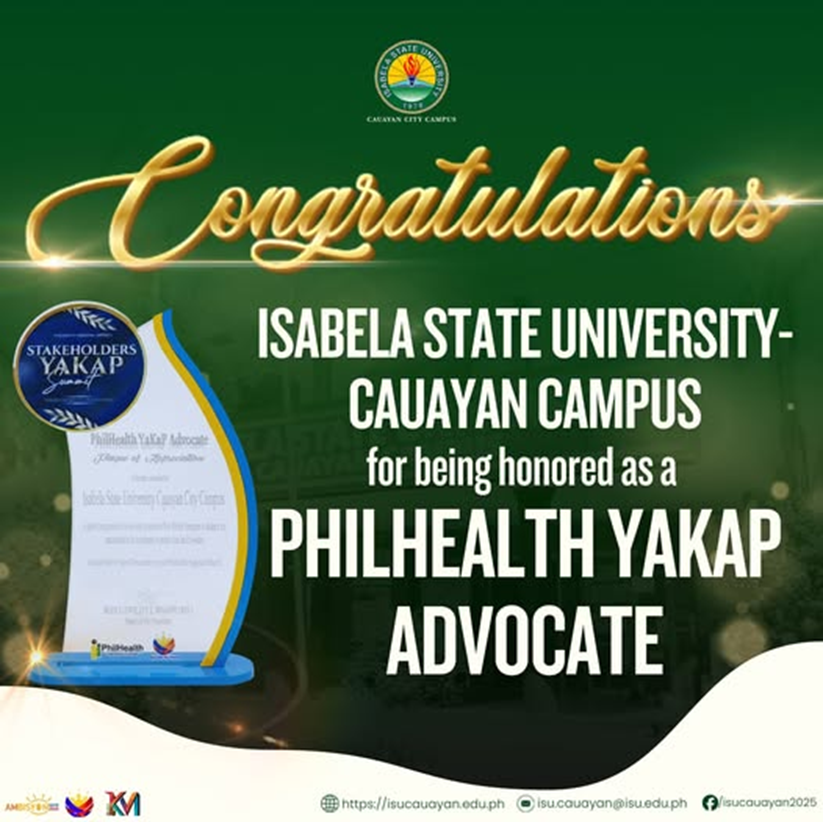 Isabela State University โ Cauayan Campus earned recognition from PhilHealth Regional Office II as a PhilHealth YAKAP Advocate during the Stakeholders Summit, December 10. This honor emphasizes the campus’ active role in delivering the First Patient Encounter to students and its strong drive to protect their health and well-being. — #OneISU | #ISUlong | #OneTeamBamboo continue reading : ๐๐๐๐๐๐ ๐๐๐๐๐๐๐๐๐๐๐โฎ ๐๐๐ ๐๐๐ฎ๐๐ฒ๐๐ง ๐๐๐๐ฎ๐ซ๐๐ฌ ๐๐ก๐ข๐ฅ๐๐๐๐ฅ๐ญ๐ก ๐๐๐๐๐ ๐๐๐ฏ๐จ๐๐๐ญ๐ ๐๐๐๐จ๐ ๐ง๐ข๐ญ๐ข๐จ๐ง