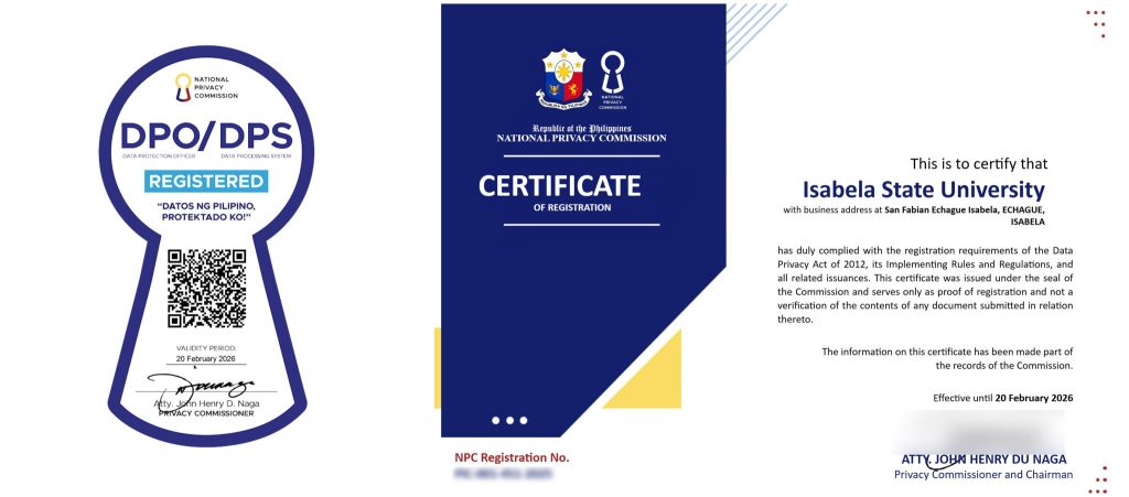 This is to certify that Isabela State University with business address at San Fabian Echague Isabela, ECHAGUE, ISABELA has duly complied with the registration requirements of the Data Privacy Act of 2012, its Implementing Rules and Regulations, and all related issuances. This certificate was issued under the seal of the Commission and serves only as prort of registration and not a verification of the contents of any document submitted in relation thereto.
